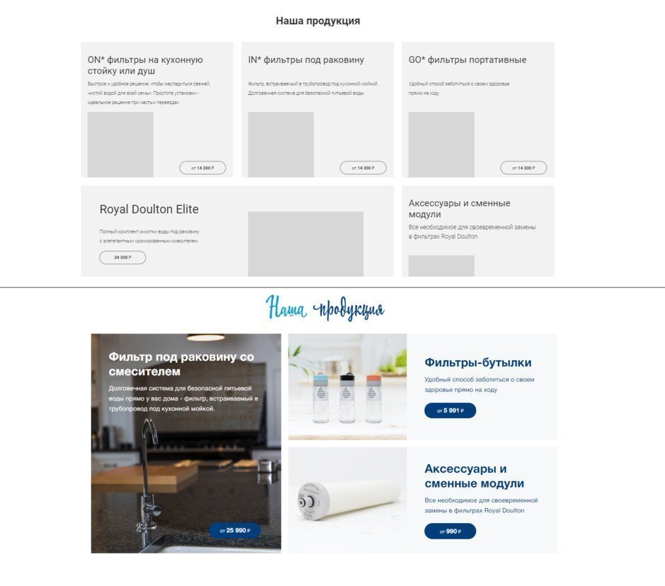 Официальный сайт британского производителя Doulton имеет строгий минималистичный стиль. Сайт корпоративный, здесь нет привычного каталога продукции. Упор сделан на визуальную составляющую и тексты. Нам нужно было создать в похожем стиле, учитывая потребности российской ЦА.
