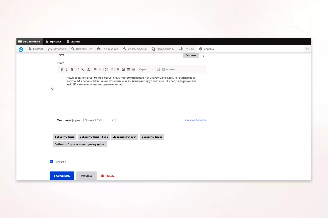 Контентную часть страницы сделали в виде параграфов для того, чтобы была возможность кастомизировать её вид. Блоки можно менять местами, выбирать только то, что нужно в конкретной услуге (галерея с фото, стилизованный нумерованный список, текст с фото, видео и т.д.). При необходимости, в любой момент можно добавить ещё параграф или убрать лишний. Получается мини-конструктор, который очень прост и удобен для заполнения даже человеком, который ранее не работал с CMS.