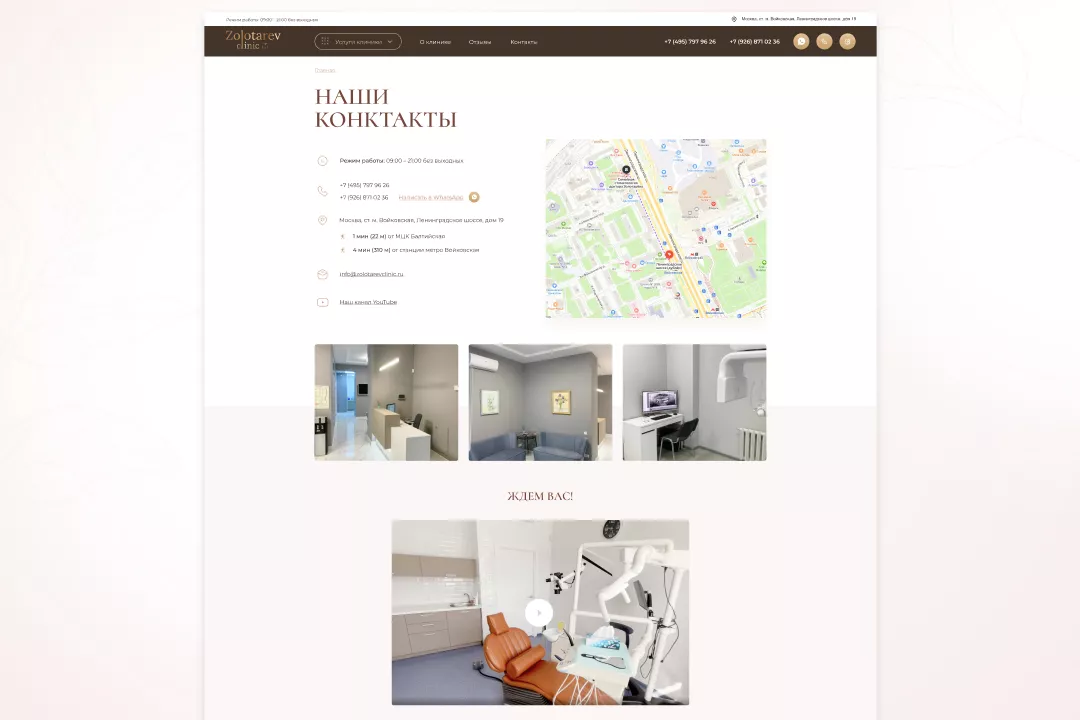 На страницу с контактами добавили карту, ближайшие станции метро, возможность написать через WhatsApp (потому что многим удобнее использовать именно его). Ниже блок с фотографиями клиники и блок с видео, чтобы пациент мог увидеть как выглядит стоматология снаружи и внутри.