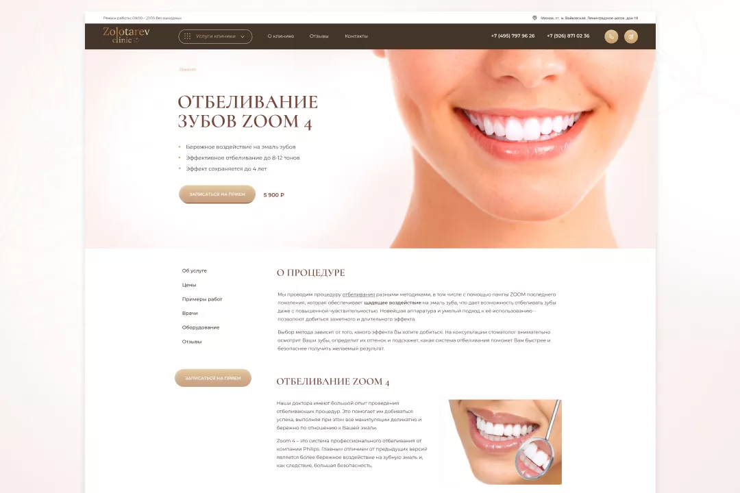 Вернёмся к корпоративному сайту для московской стоматологии доктора Золотарёва. Артём Сергеевич открыл стоматологию, собрал команду хороших специалистов, установил самое крутое оборудование для лечения и диагностики и теперь принимает пациентов любого возраста. Лечит без боли, что обычно сильно пугает всех людей от мала до велика с проблемными зубами. Поэтому сайт главврача Золотарёва должен был не только приводить пациентов, но и снимать их страхи перед посещением.