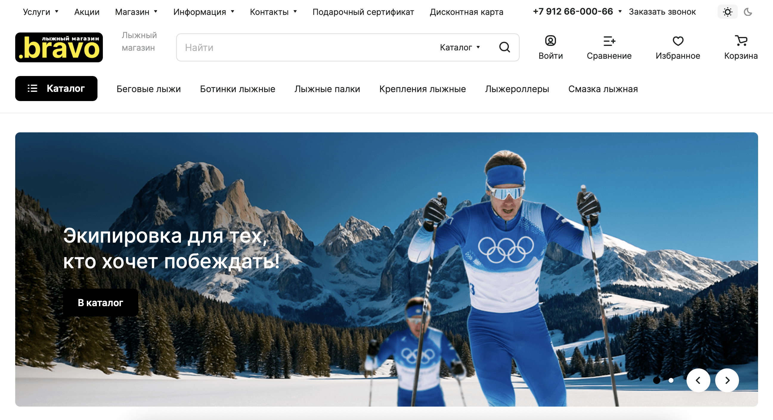 Лыжный магазин «BRAVO» обратился к нам в RANX с запросом на создание современного интернет-магазина «под ключ». Бизнес клиента совмещает несколько направлений: — продажу спортивных товаров для лыжного спорта, — обучение в собственной школе лыжников, — аренду и обслуживание снаряжения.