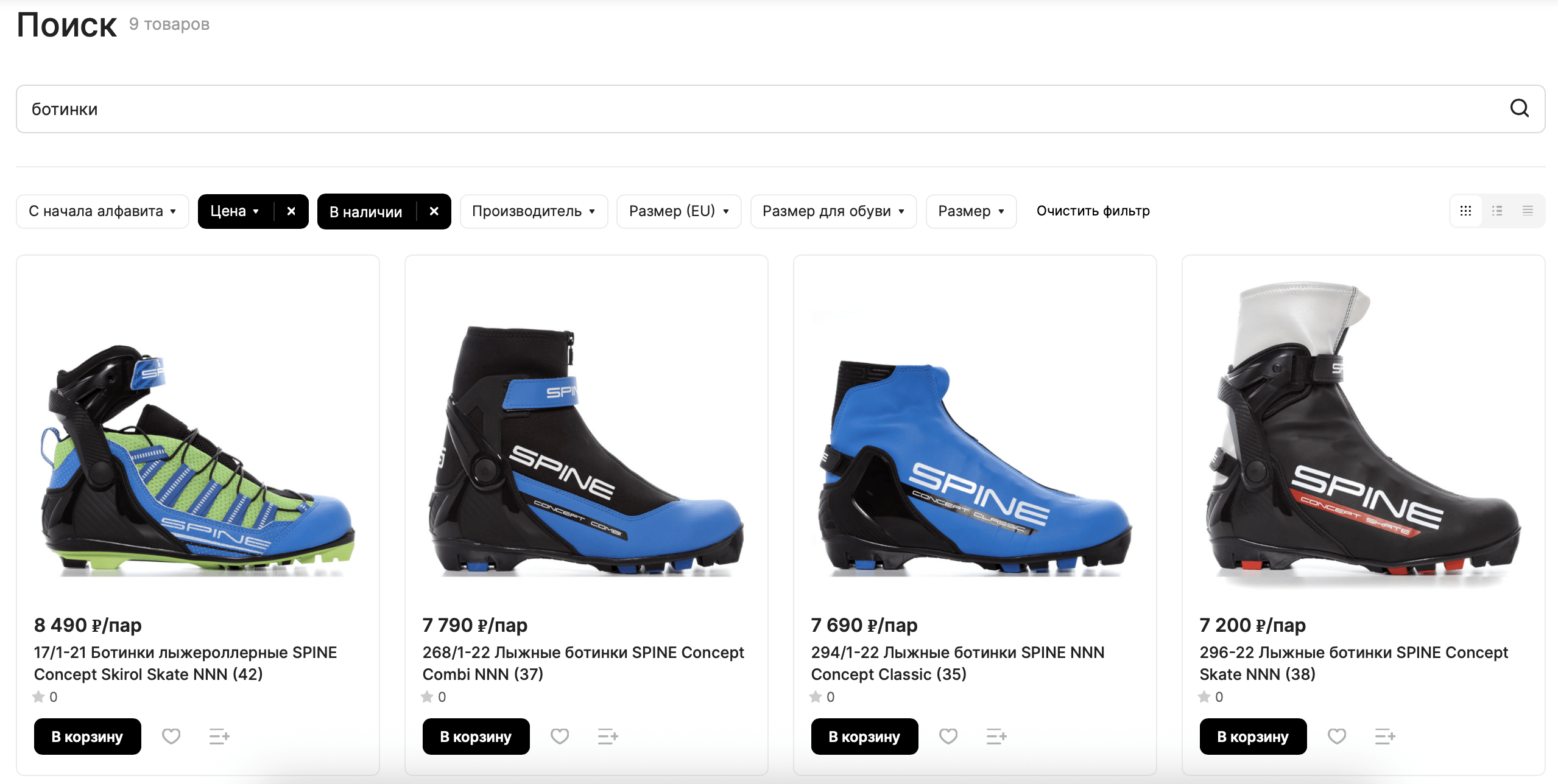 В каталоге товары удобно отсортированы по типу снаряжения, брендам и назначению.