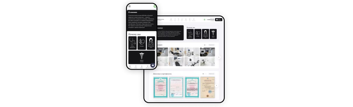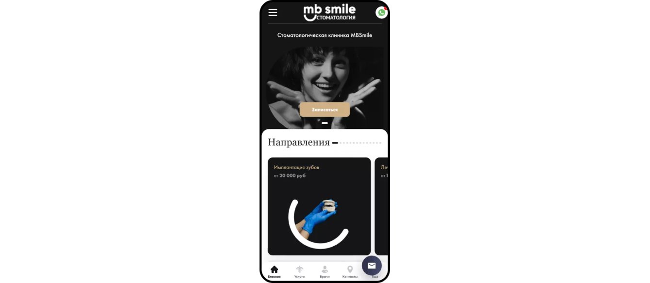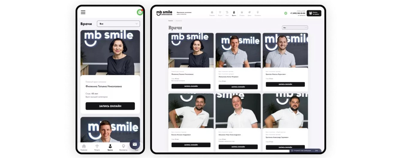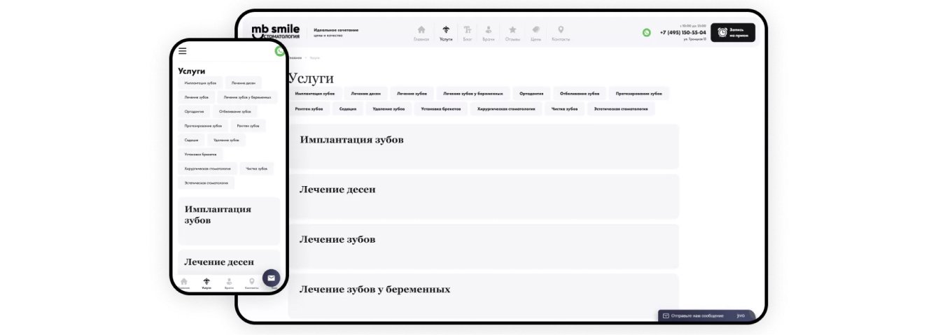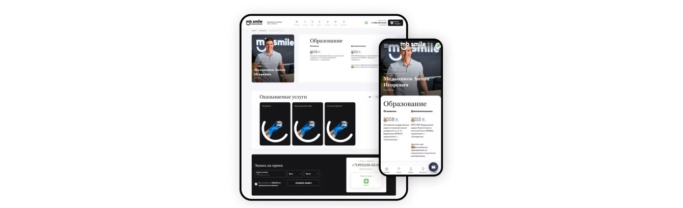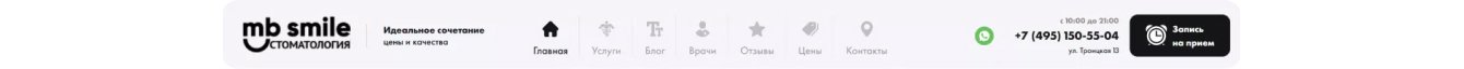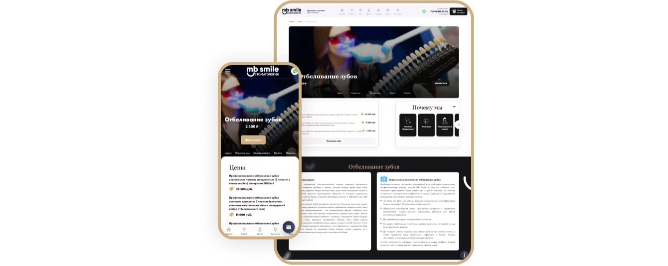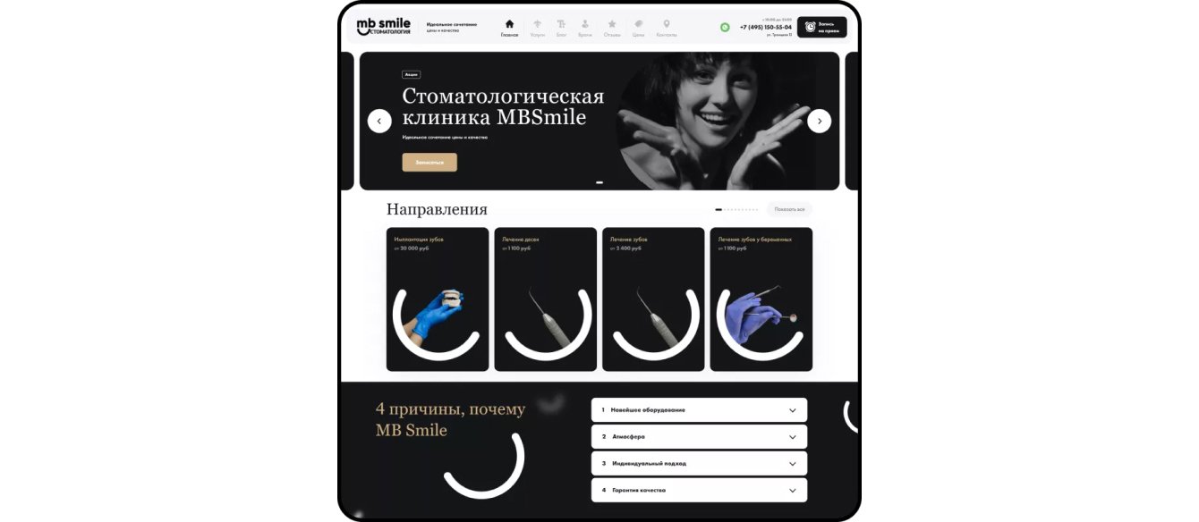 Разрабатывая дизайн для стоматологии MB Smile, мы ориентировались на строгий стиль, который бы повторял оформление офиса клиники, но при этом не отталкивал бы пользователя темными оттенками.