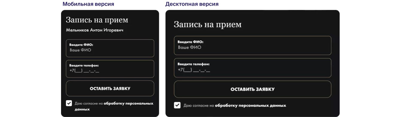 ● Простые формы заявок, в которых пациенту нужно оставить ФИО и номер телефона.