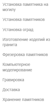 Например, вместо обобщённых «Каталог памятников» или «Продукция» — «Двойные памятники из гранита», «Памятники из лалварского гранита», и так далее.