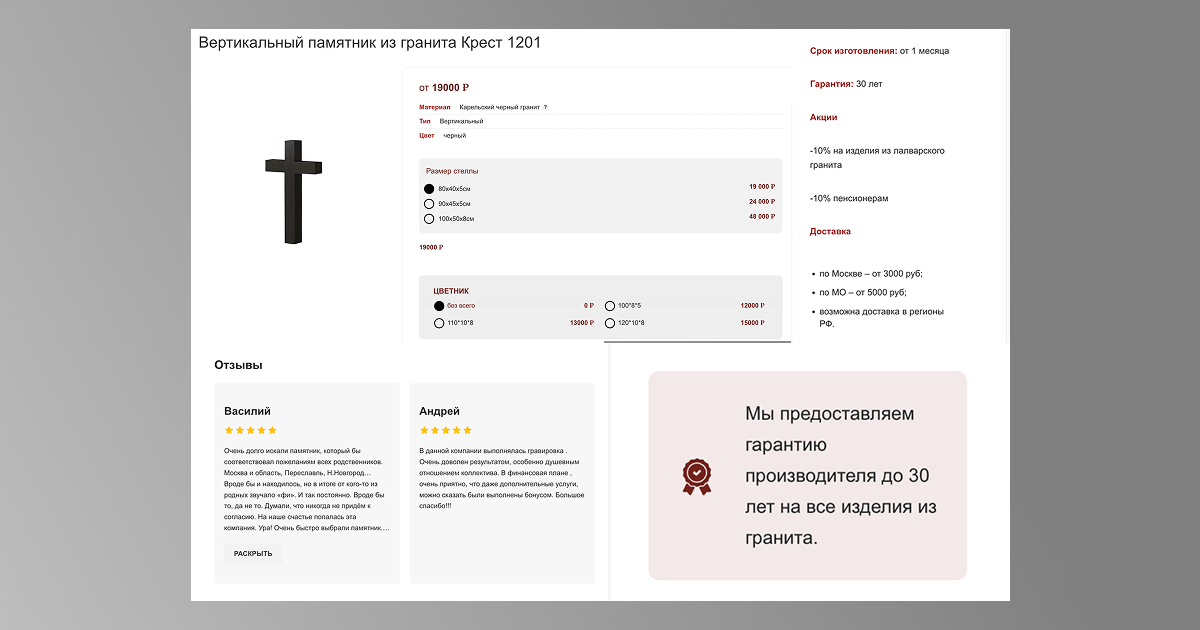 — Блок «Из чего складывается стоимость памятника» — объяснили, какие факторы влияют на цену. Это снижает тревожность и помогает избежать ощущения «непрозрачного ценообразования».