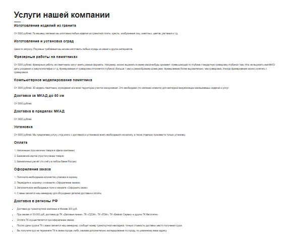 Пример: Вместо сухой фразы «Мы изготавливаем памятники из гранита» — «Все памятники изготавливаются из натурального лалварского гранита. Мы получаем материал напрямую с собственного карьера, а работы ведутся на собственном производстве. Это позволяет нам контролировать каждый этап — от распила до полировки».
