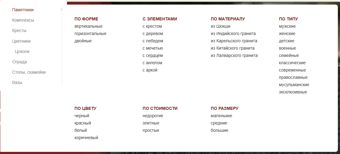 — По типам изделий: «памятники с ангелом», «двойной памятник из гранита», «памятник с крестом», «мусульманские памятники», «стела на могилу».