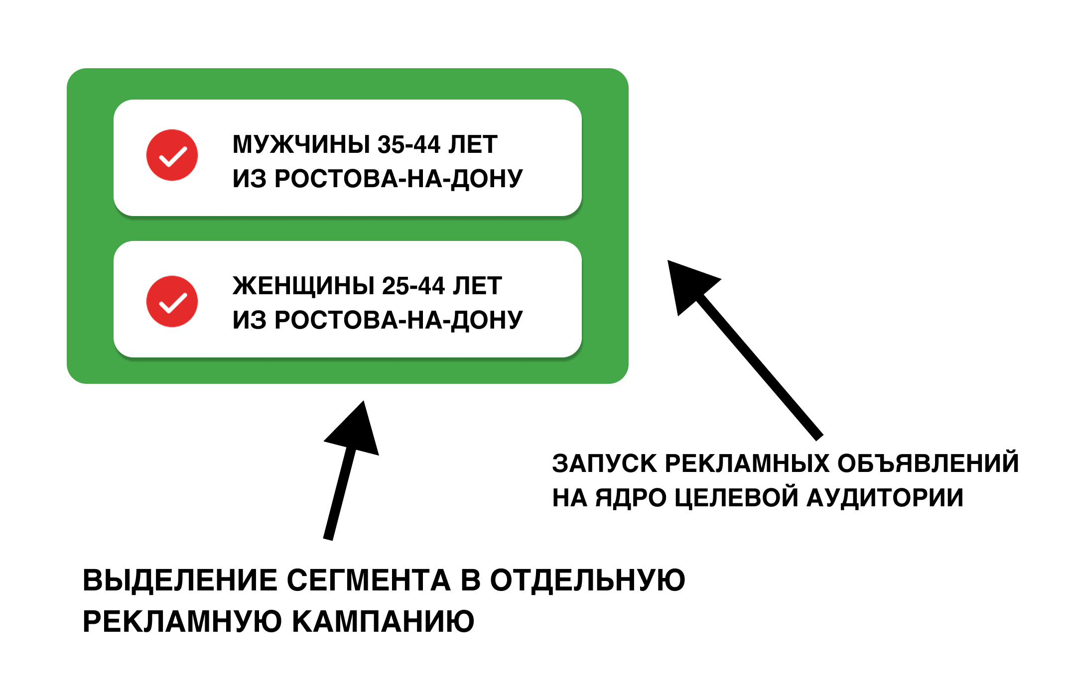 В результате был определен «золотой сегмент»: женщины 25–44 лет из Ростова-на-Дону и мужчины 35–44 лет из Ростова-на-Дону. Под эту аудиторию выделили отдельную рекламную кампанию и настроили показы рекламных объявлений именно на нее.