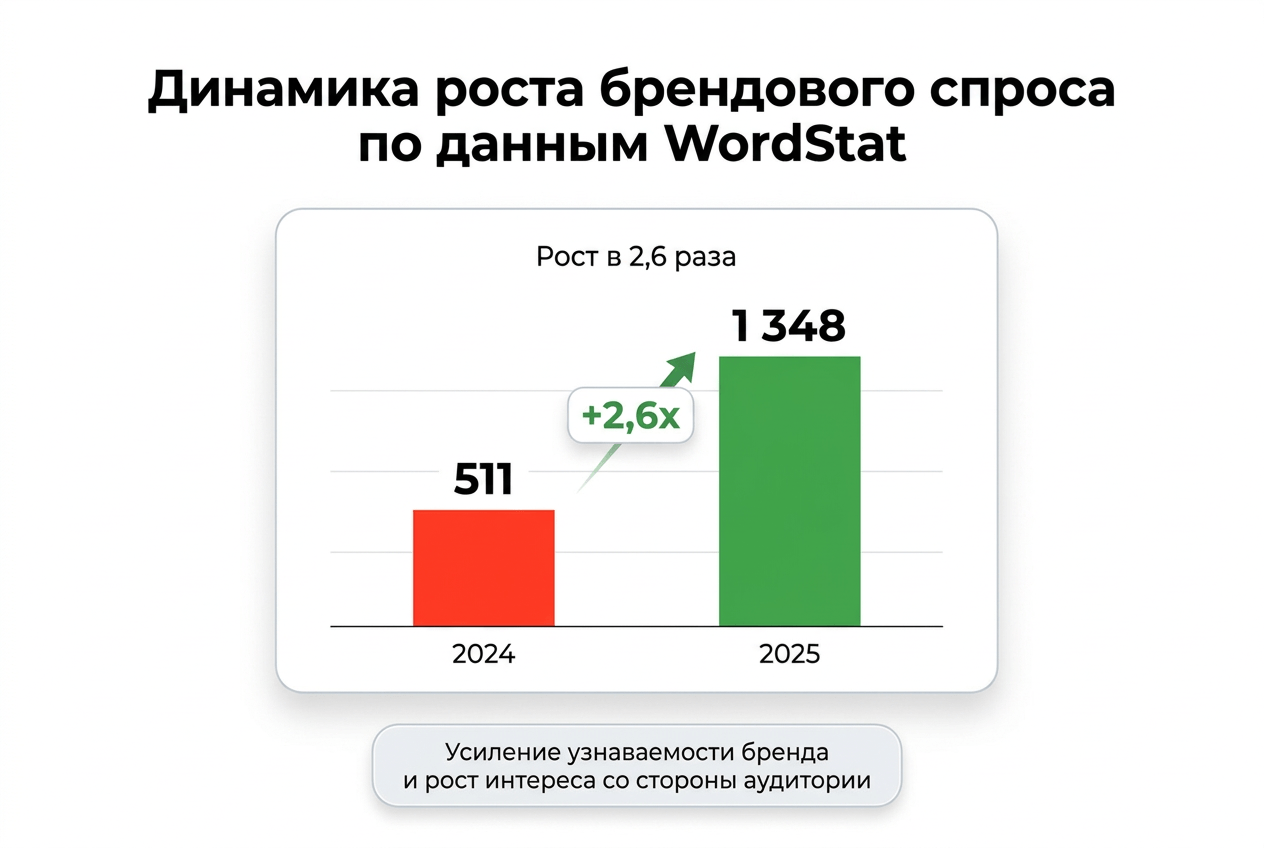- рост брендового спроса в 2,6 раза с 511 до 1 348 запросов;