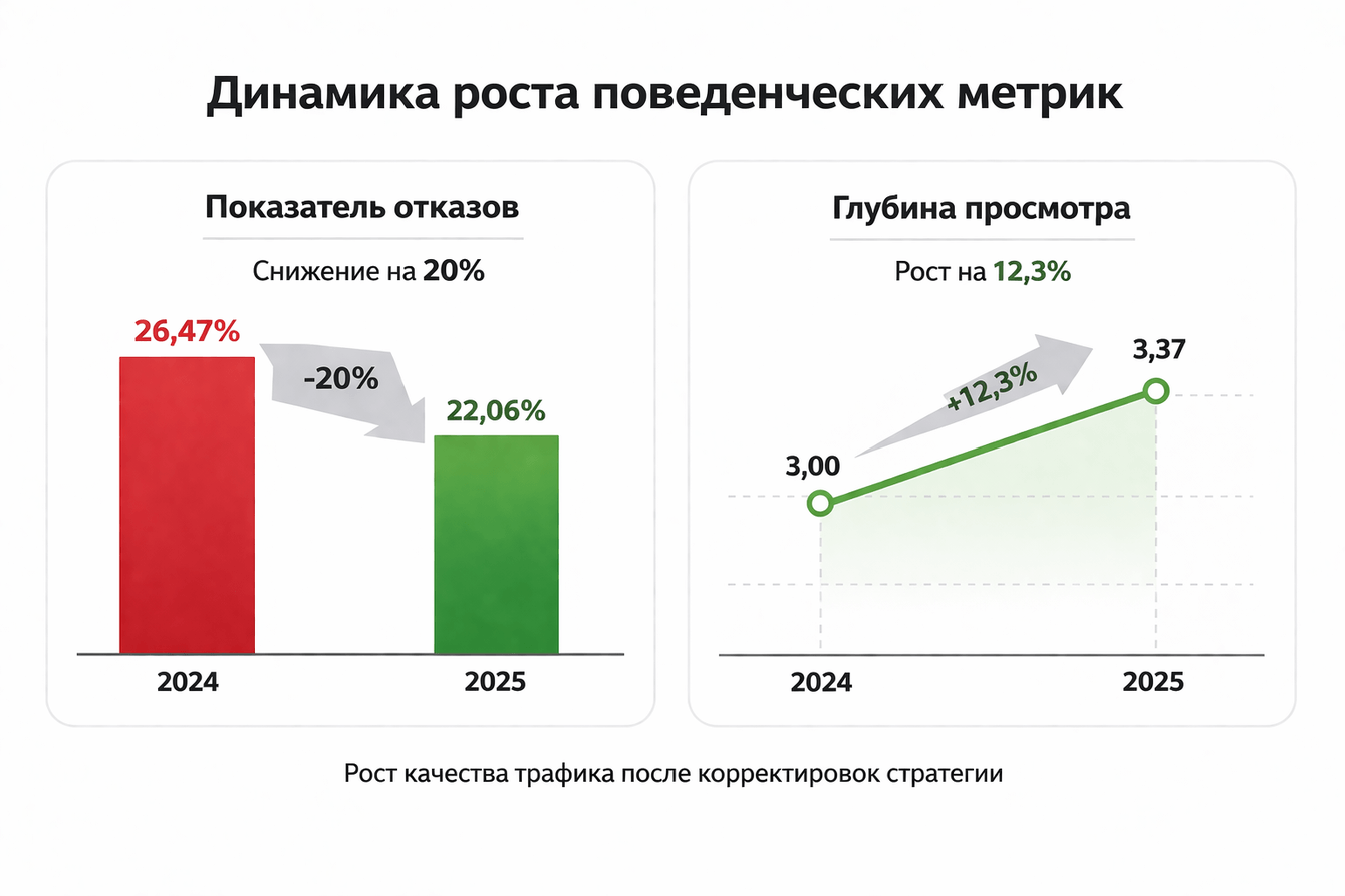 На основе этих данных скорректировали рекламную логику: пересобрали часть объявлений, уточнили формулировки и начали точнее работать с входящим трафиком. В результате удалось существенно улучшить поведенческие показатели: показатель отказов снизился на 15%, а глубина просмотра выросла с 3,00 до 3,37. Это подтвердило, что трафик стал более релевантным и вовлеченным.