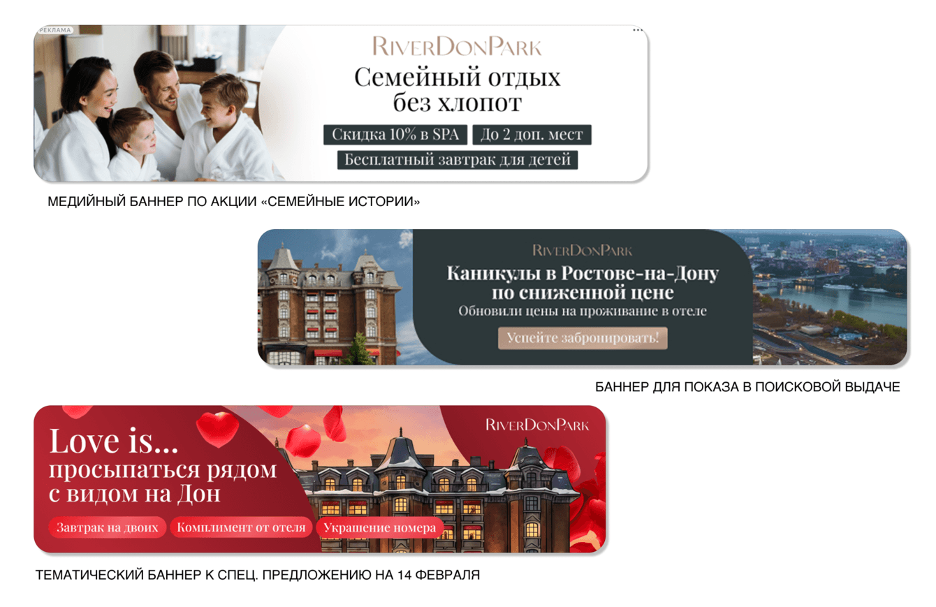 River Don Park — ресторанно-гостиничный комплекс в Ростове-на-Дону, расположенный на левом берегу Дона, в 5 минутах от центра города. Комплекс объединяет несколько направлений: отель, ресторан, банкетный зал, SPA и конференц-зал, поэтому в рекламе важно было работать не только с прямым спросом на размещение, но и в целом усиливать присутствие бренда в конкурентной нише.