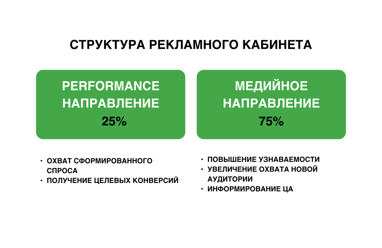 Уже на этом этапе зафиксировали распределение бюджета: основная доля (75%) была закреплена за охватными кампаниями, так как именно они должны были обеспечивать широкое присутствие бренда и регулярный контакт с аудиторией. Поисковое направление в этой связке велось как поддерживающее: через него забирали уже существующий спрос и отслеживали, как аудитория взаимодействует с сайтом после перехода.