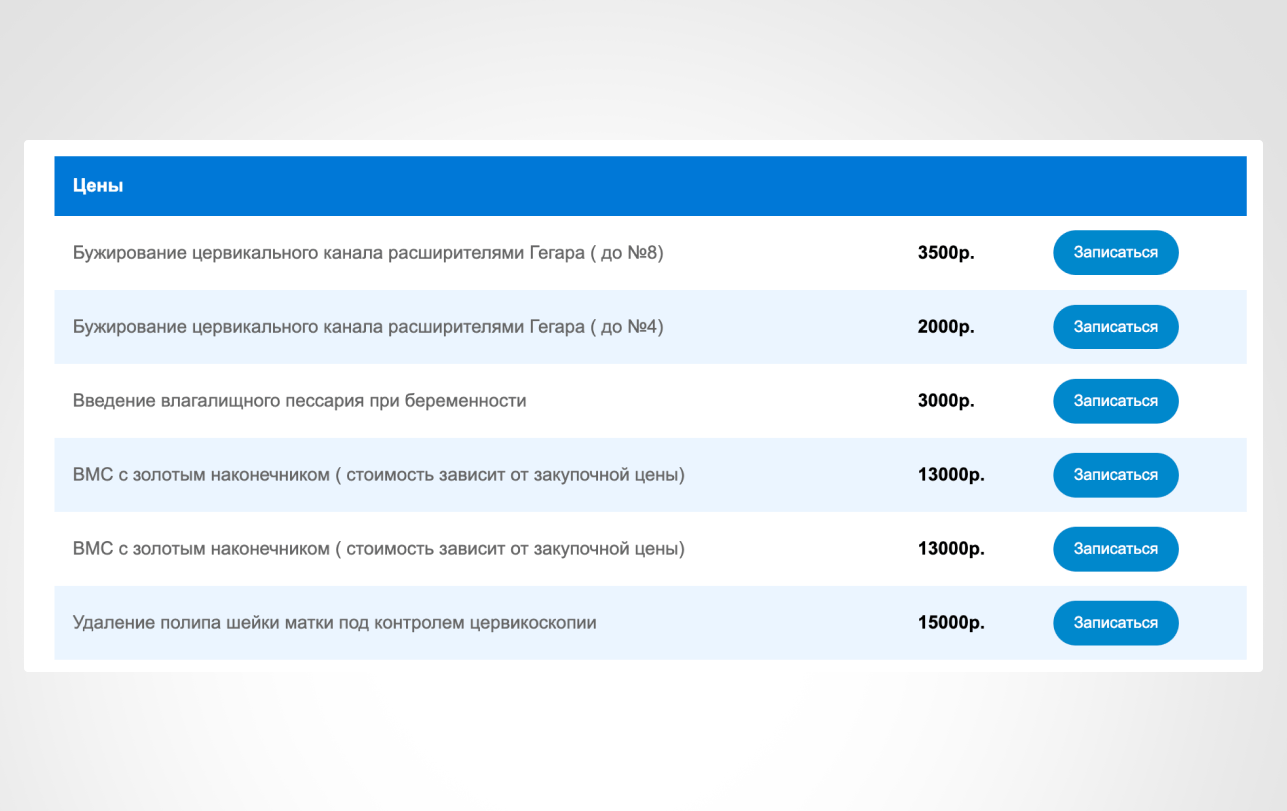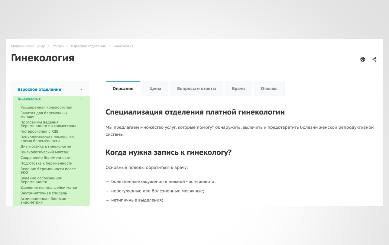 Пример: раздел «Гинекология». Раньше на сайте была только одна общая страница, теперь он включает 40 подразделов по отдельным услугам