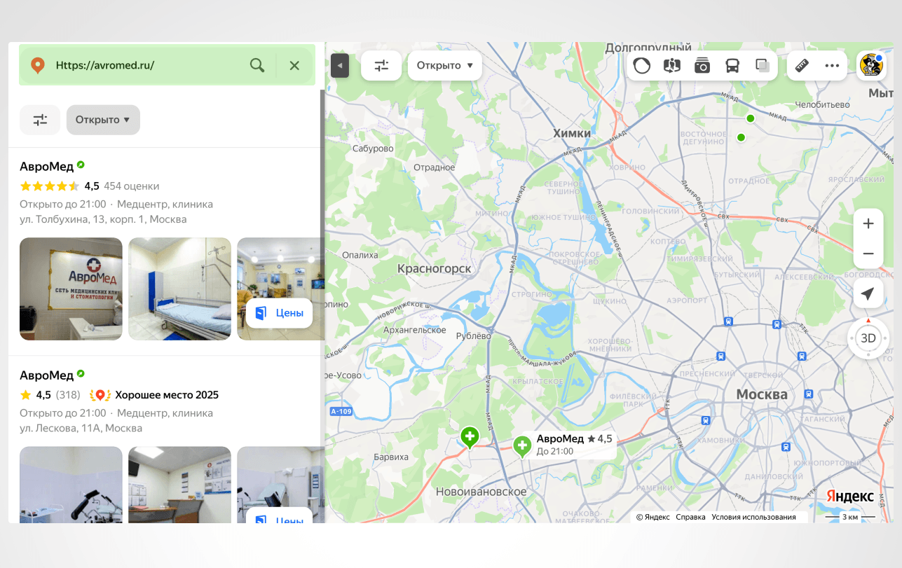 Результат: после привязки сайт стал корректно отображаться в сервисах Яндекса и Google как реальная клиника, что усилило ранжирование по геозависимым запросам и повысило кликабельность карточек.