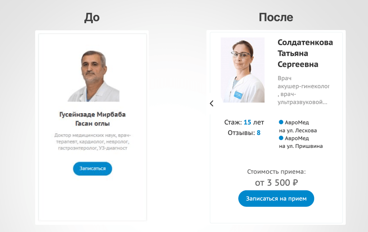 Также доработали превью карточек врачей: вывели стаж, отзывы, адрес клиники и цену.