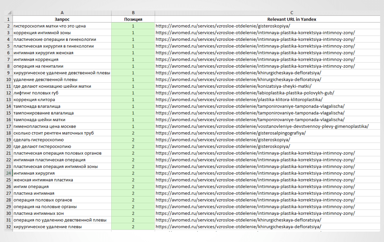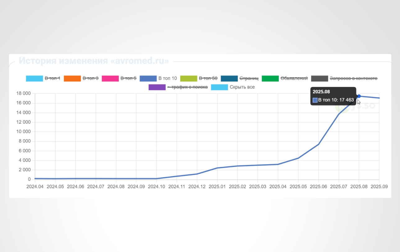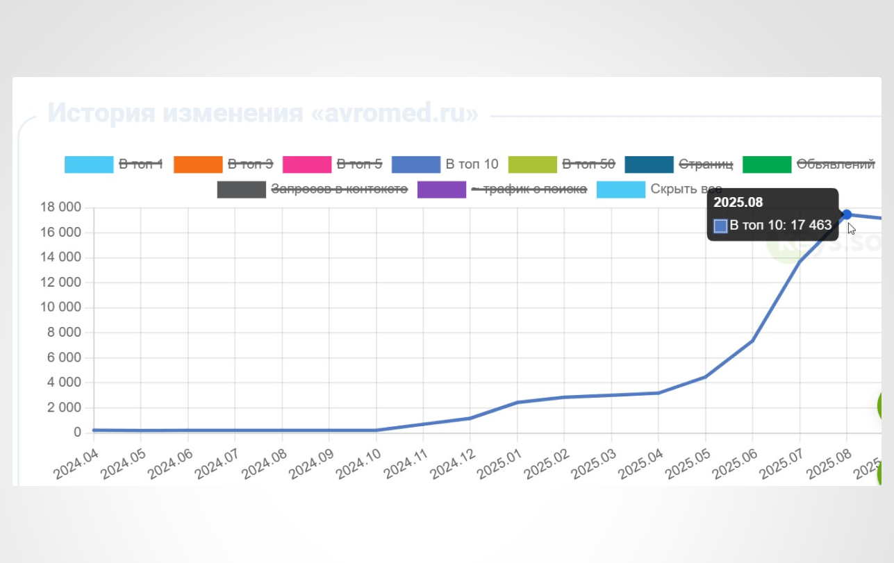 Первым шагом стало формирование и кластеризация семантического ядра. Для медицинской тематики это критически важно: разные услуги и направления имеют широкий спектр запросов, и без правильно структурированного ядра невозможно построить эффективную стратегию продвижения.