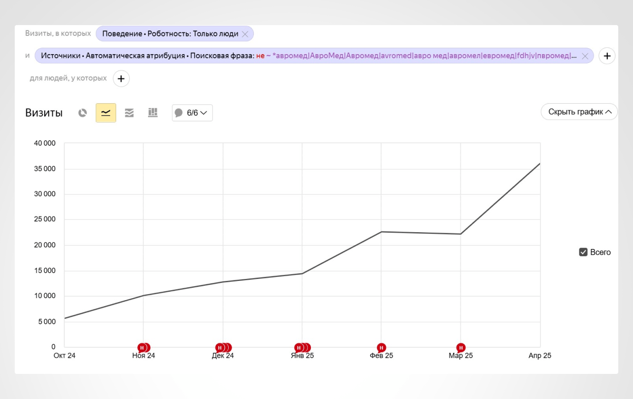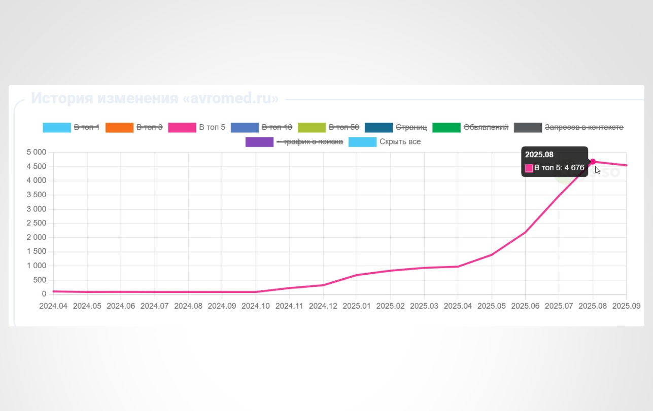 Клиент — сеть медицинских клиник — обратился с типовой для отрасли проблемой: сайт практически не приносил заявок из поиска. При среднем ежемесячном трафике в 5 000 визитов конверсия в лиды оставалась крайне низкой.