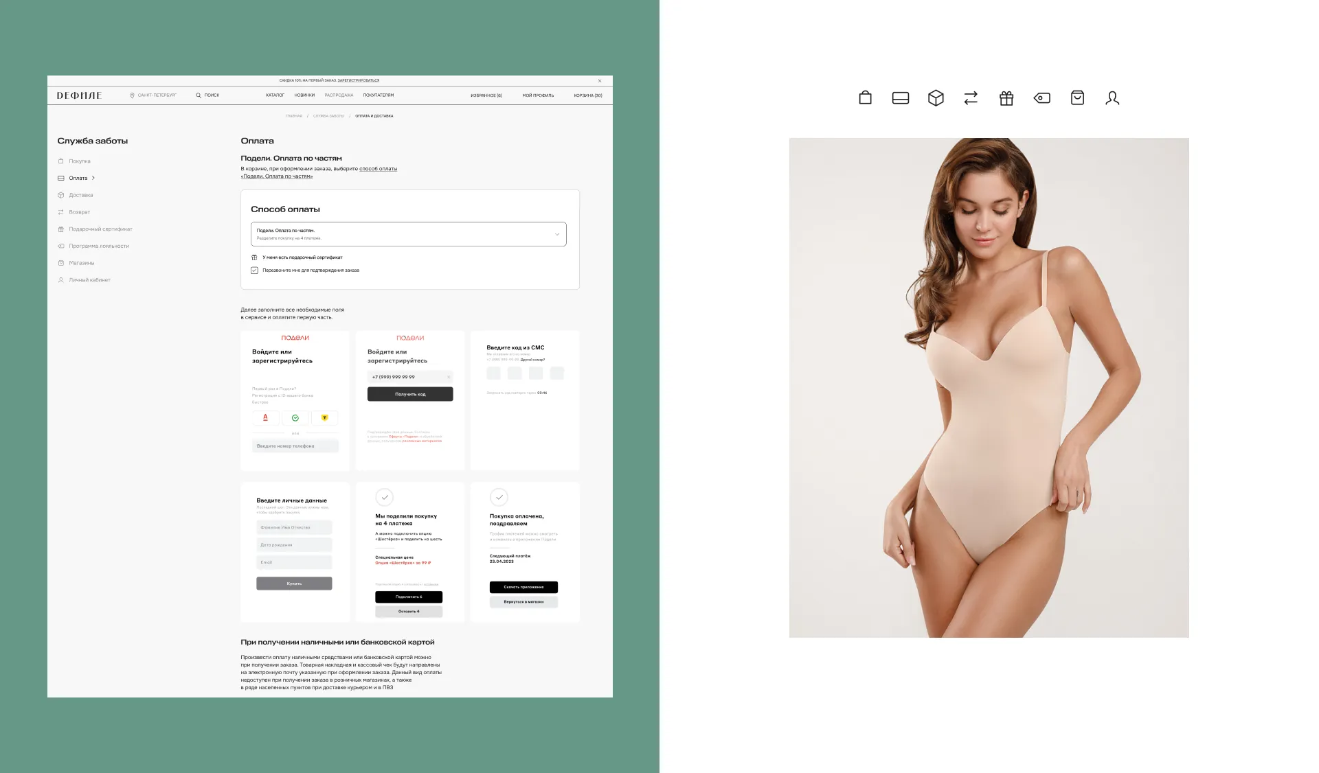 Мы дополнили архитектуру сайта разделом “Служба заботы”, в котором собрана вся необходимая информация для пользователей. Всё, что касается условий покупки, оплаты, доставки и возврат товара.