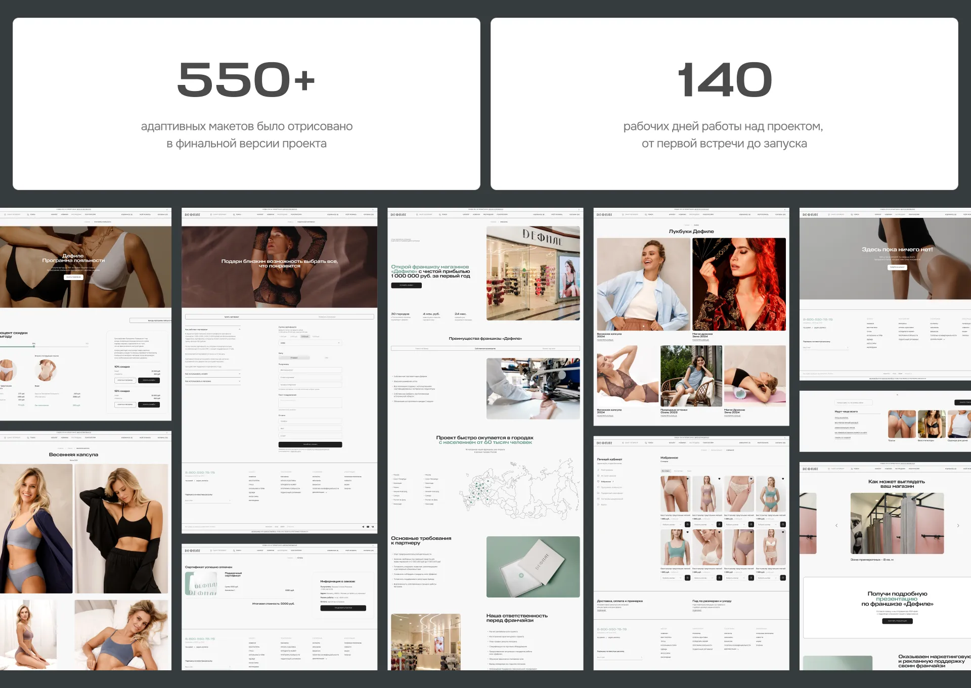 Спроектировали новую версию и нарисовали раздел, где добавлены все магазины сети Дефиле (можно увидеть их количество). Магазинов у компании очень много и пользователям на старой версии сайта было непросто найти нужный для себя магазин.