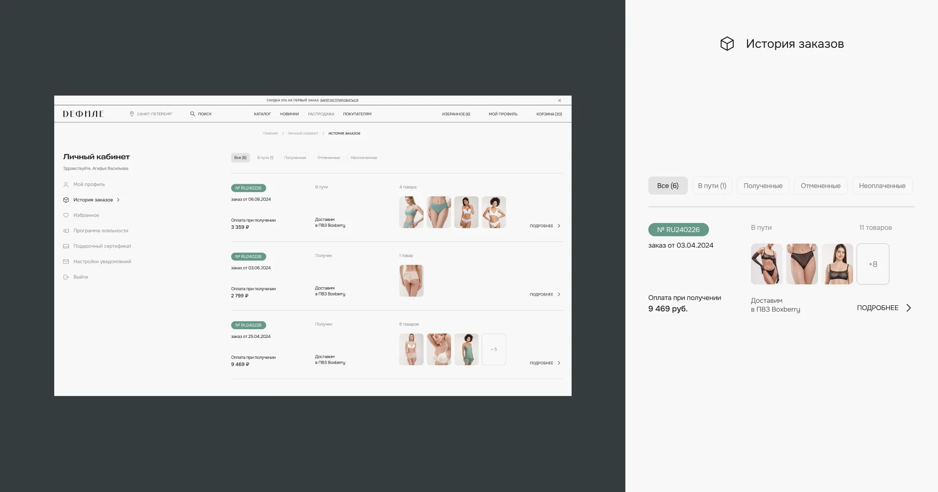 В новом личном кабинете обновили раздел История Заказов. Теперь пользователи могут видеть не только все сделанные заказы, но и сегментировать их по полученным, неоплаченным или тем, которые находятся в стадии доставки.