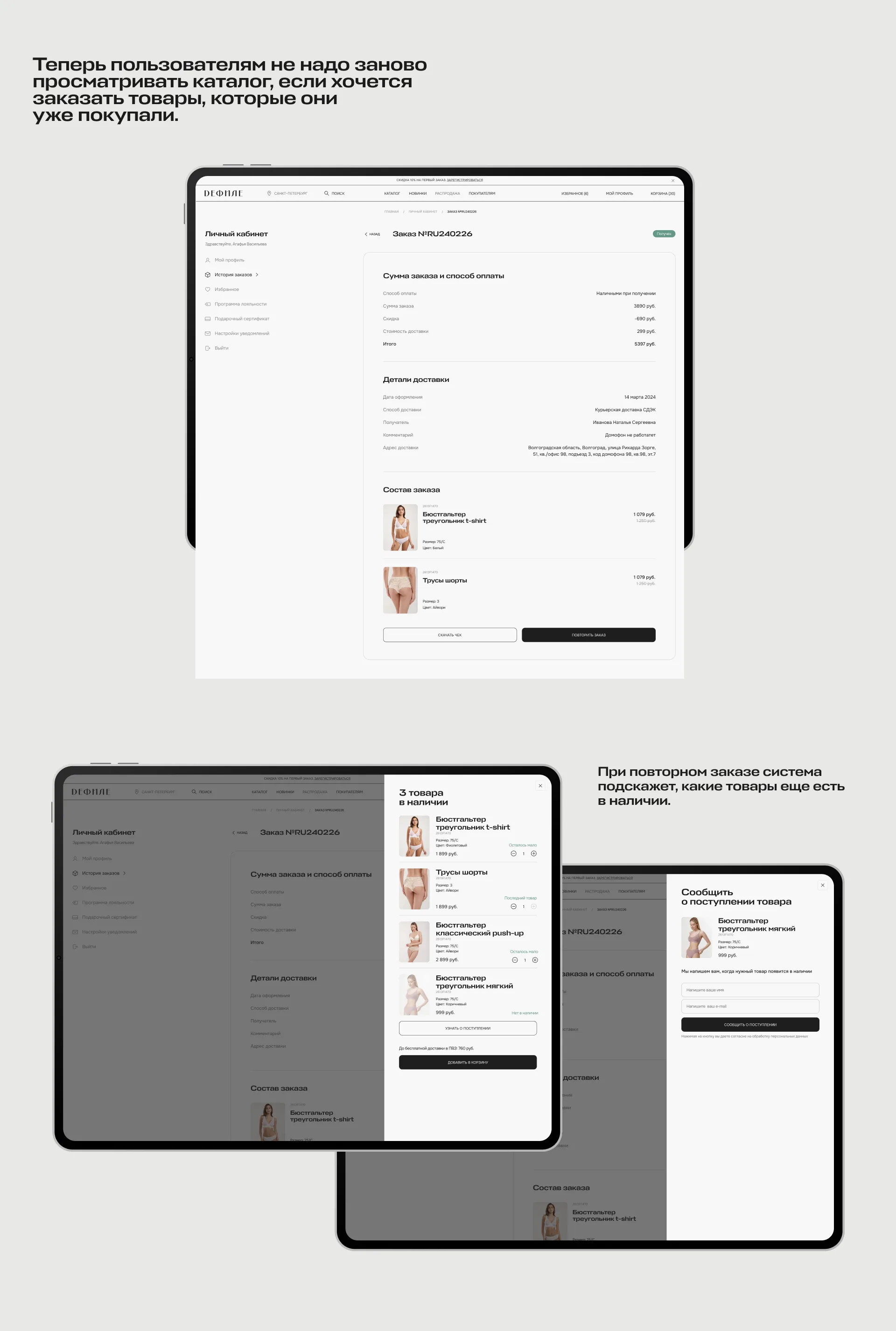 Если пользователи хотят повторить заказ — им не нужно заново смотреть весь каталог и выбирать размеры. Они могут выбрать из заказов, которые уже совершали. При повторном заказе система подскажет, какие товары еще есть в наличии.
