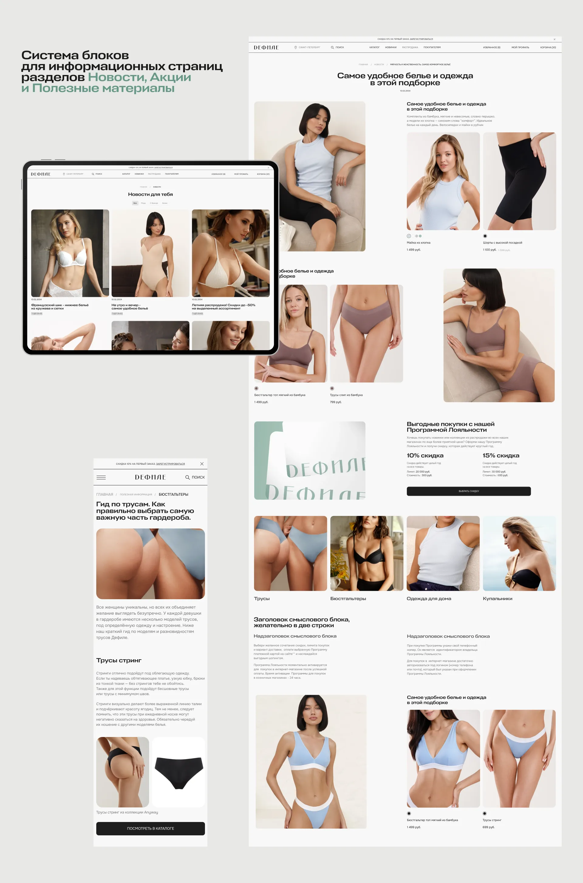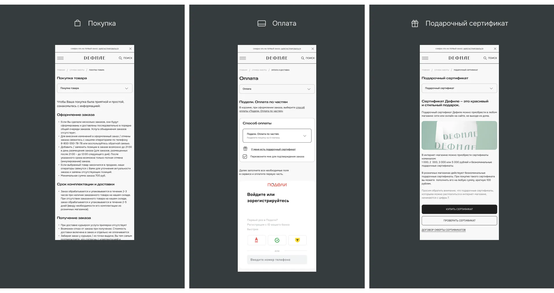 После конкурентного анализа, масштабного бенчмаркинга и изучение метрик, мы предложили команде Дефиле дополнить сайт важными для покупателя разделами.