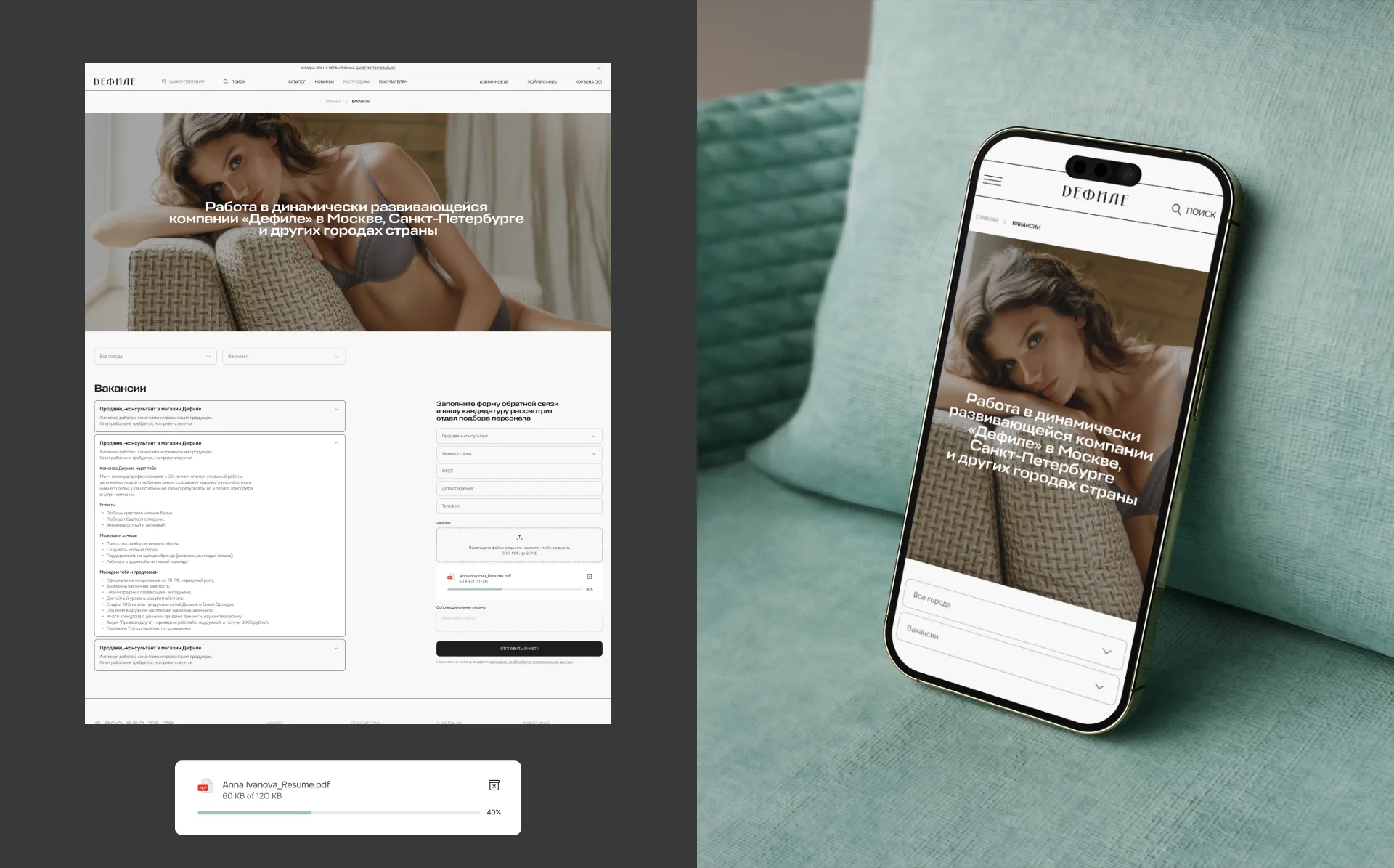 Теперь на одной странице можно выбрать город, увидеть доступные вакансии в компании для этого города и сразу же заполнить заявку соискателя. Добавили опцию загрузки стороннего файла с резюме, дополнительно к заявке.