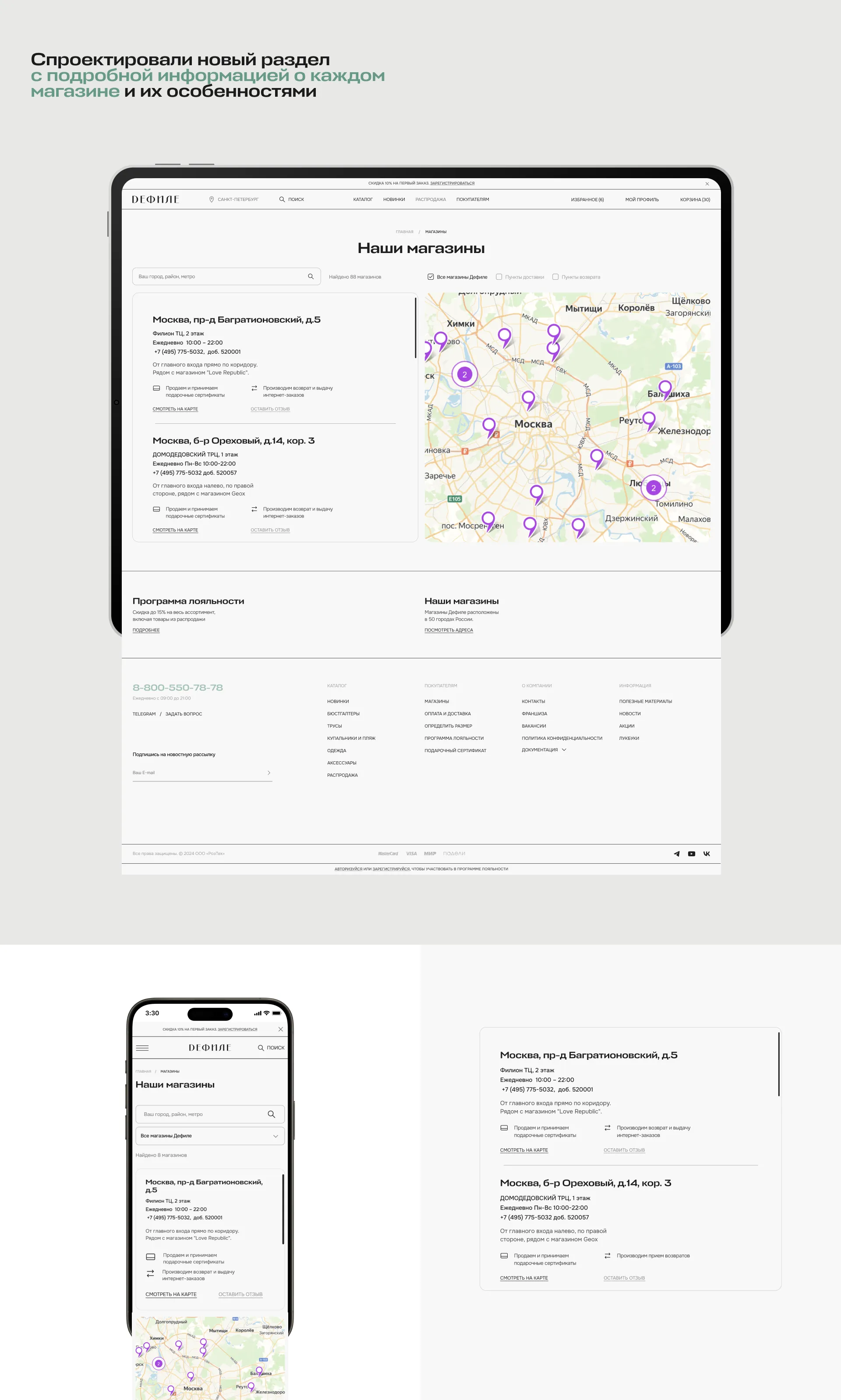 Спроектировали новую версию и нарисовали раздел, где добавлены все магазины сети Дефиле (можно увидеть их количество). Магазинов у компании очень много и пользователям на старой версии сайта было непросто найти нужный для себя магазин.