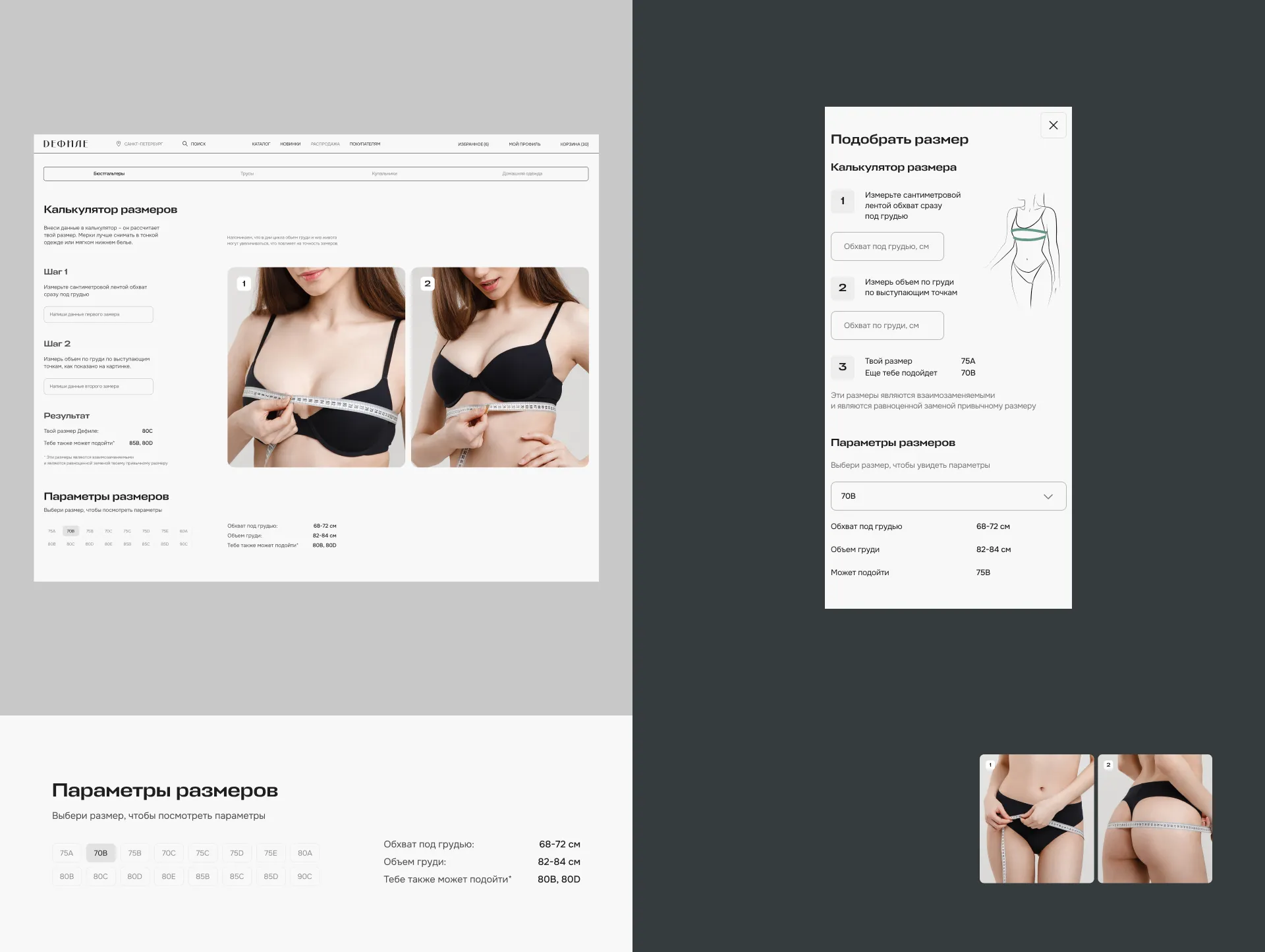Мы сделали в карточке товара модальное окно с подсказками. В этом окне можно увидеть, как правильно измерять параметры. После внесения данных система подскажет, какой размер подойдет и есть ли взаимозаменяемый размер из представленных в наличии.