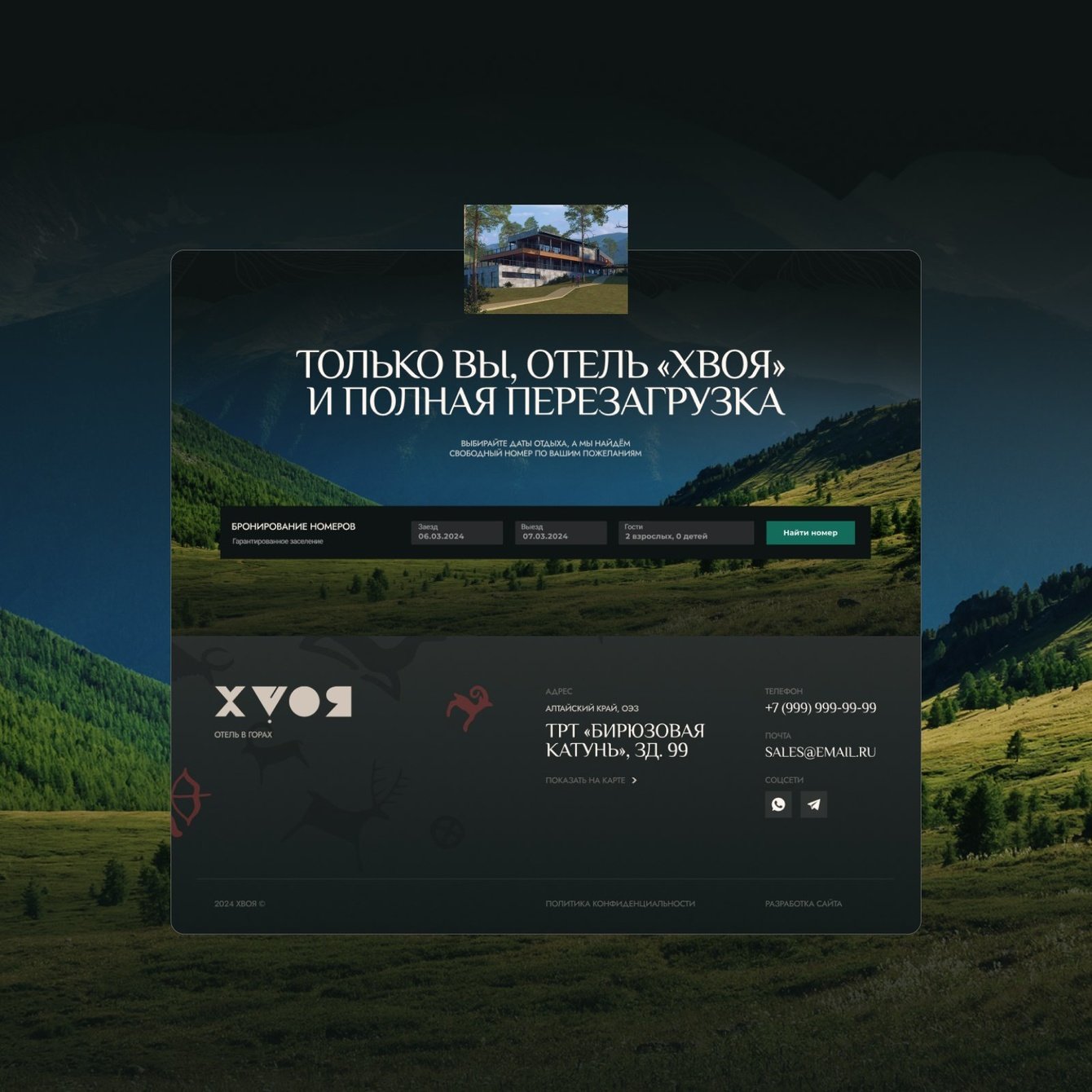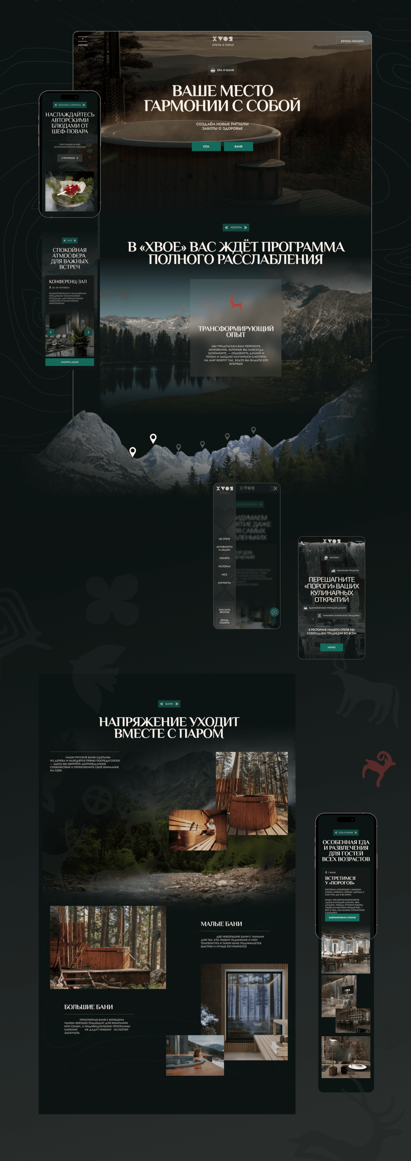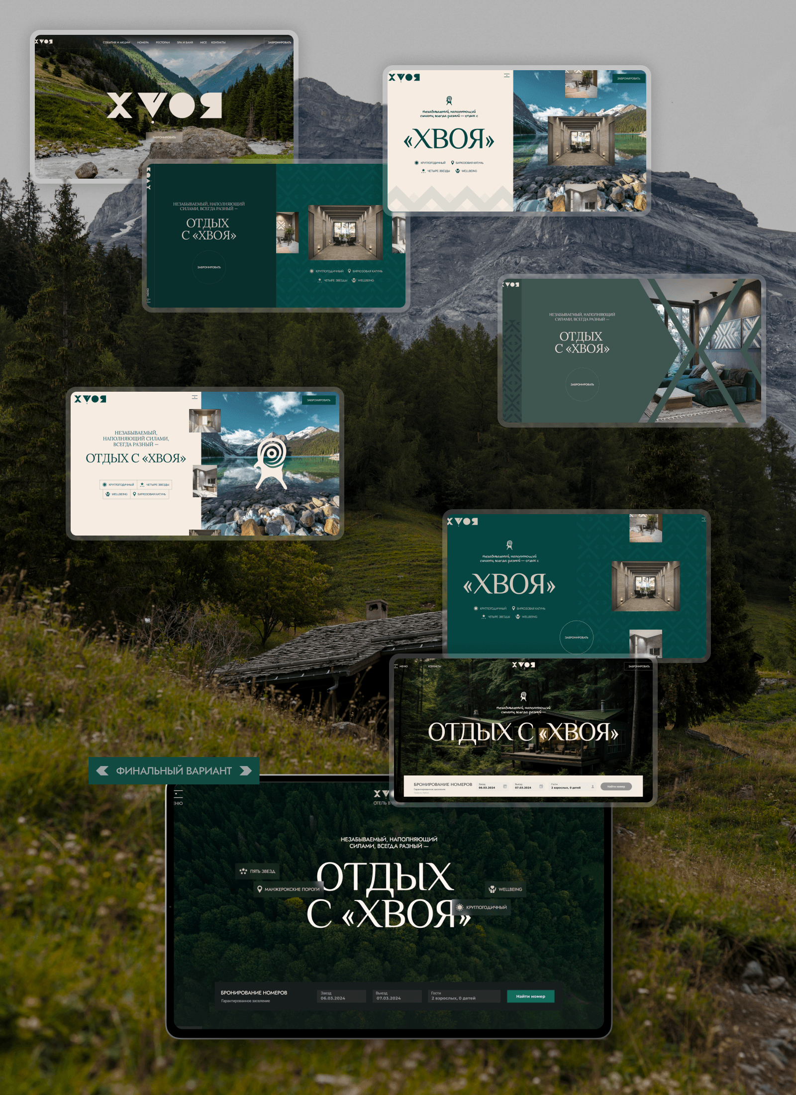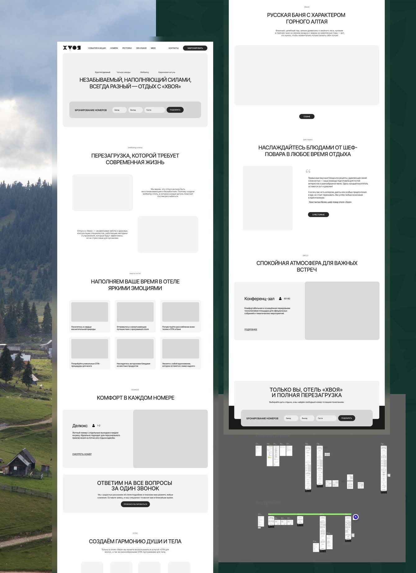 К нам обратились представители парк-отеля «Хвоя в горах» с просьбой сделать многостраничный сайт. Клиент уже был знаком с нашим особенным подходом к работе через другие проекты в сфере хореки. Именно наш взгляд на позиционирование, брендинг, смыслы и дизайн привлекли заказчика — хотелось разработать уникальную концепцию отеля, чтобы убедительно и интересно привлечь гостей в совершенно новое место.