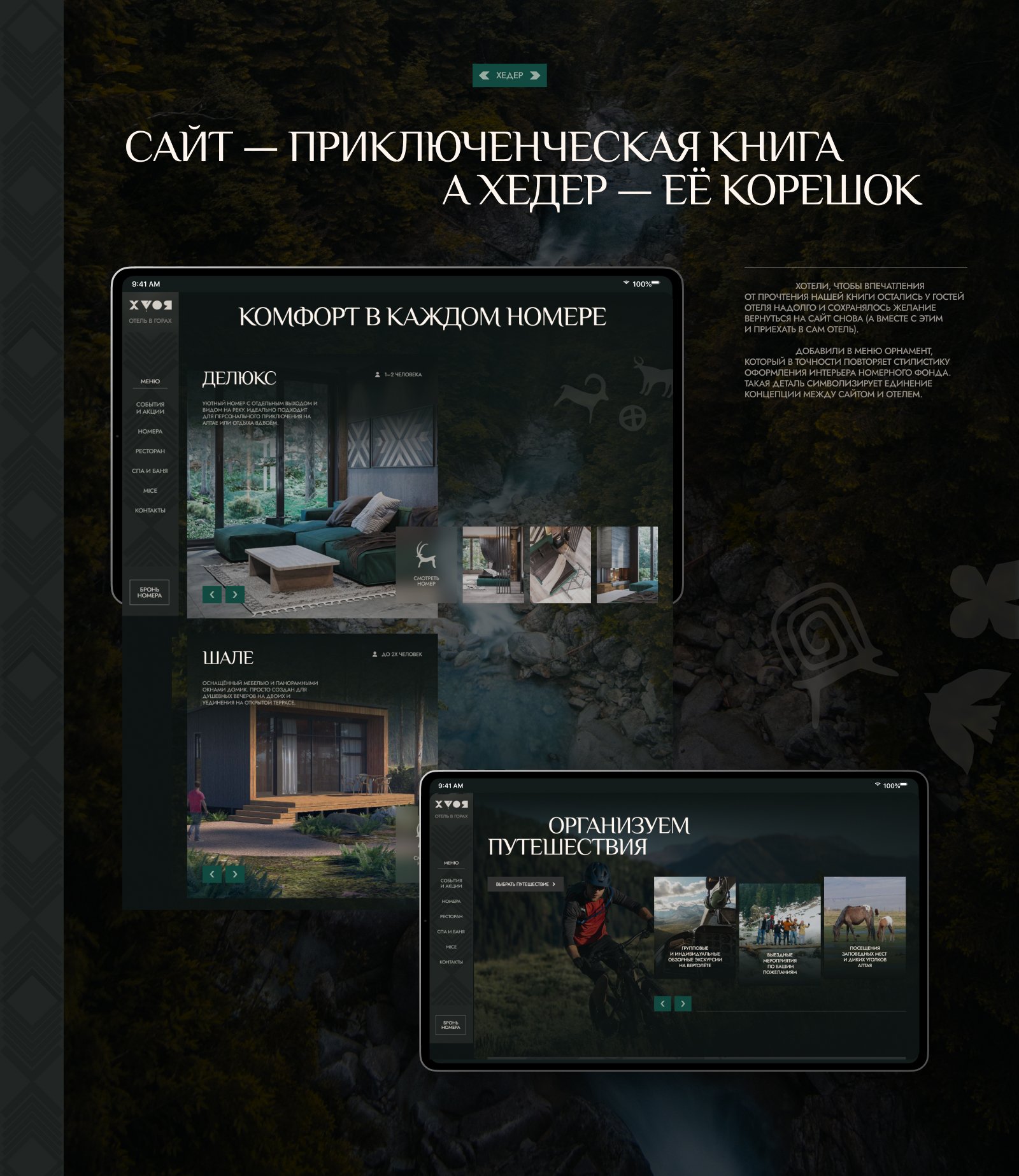 Хедер, вопреки стандартному расположению, зафиксировали сбоку, чтобы создавалось ощущение будто сайт — приключенческая книга, а хедер — её корешок. Хотели, чтобы впечатления от прочтения нашей книги остались у гостей отеля надолго и сохранялось желание вернуться на сайт снова (а вместе с этим и приехать в сам отель).