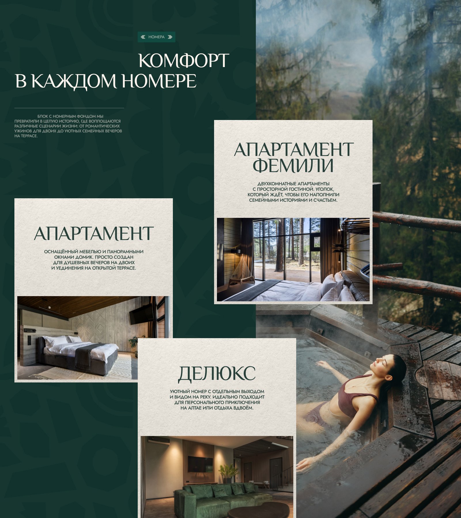 Например, стандартный для всех сайтов отелей блок с номерным фондом мы превратили в целую историю, где воплощаются различные сценарии жизни: от романтических ужинов для двоих до уютных семейных вечеров на террасе.