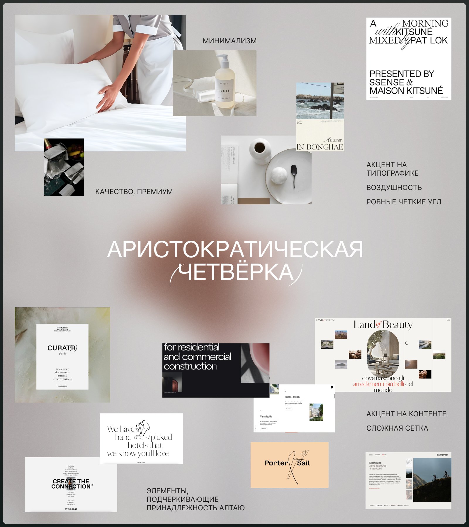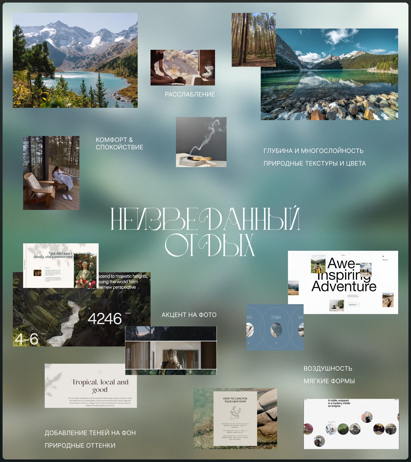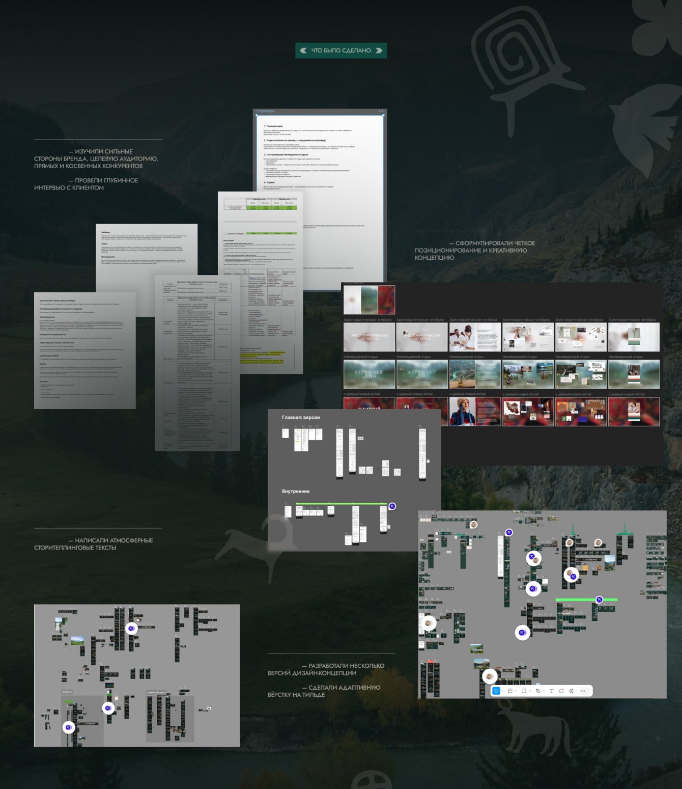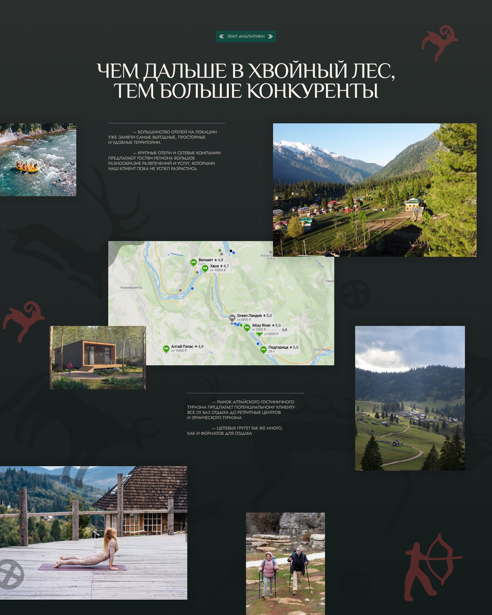 После анализа интервью и сопоставления информации с аналитикой мы выделили несколько направлений, которые могли лечь в основу брендинга и позиционирования отеля: интуитивный сервис, wellbeing и колорит Алтая. Эти дирекции мы решили исследовать в креативных концепциях, а затем сформулировать целостное позиционирование вместе с клиентом.
