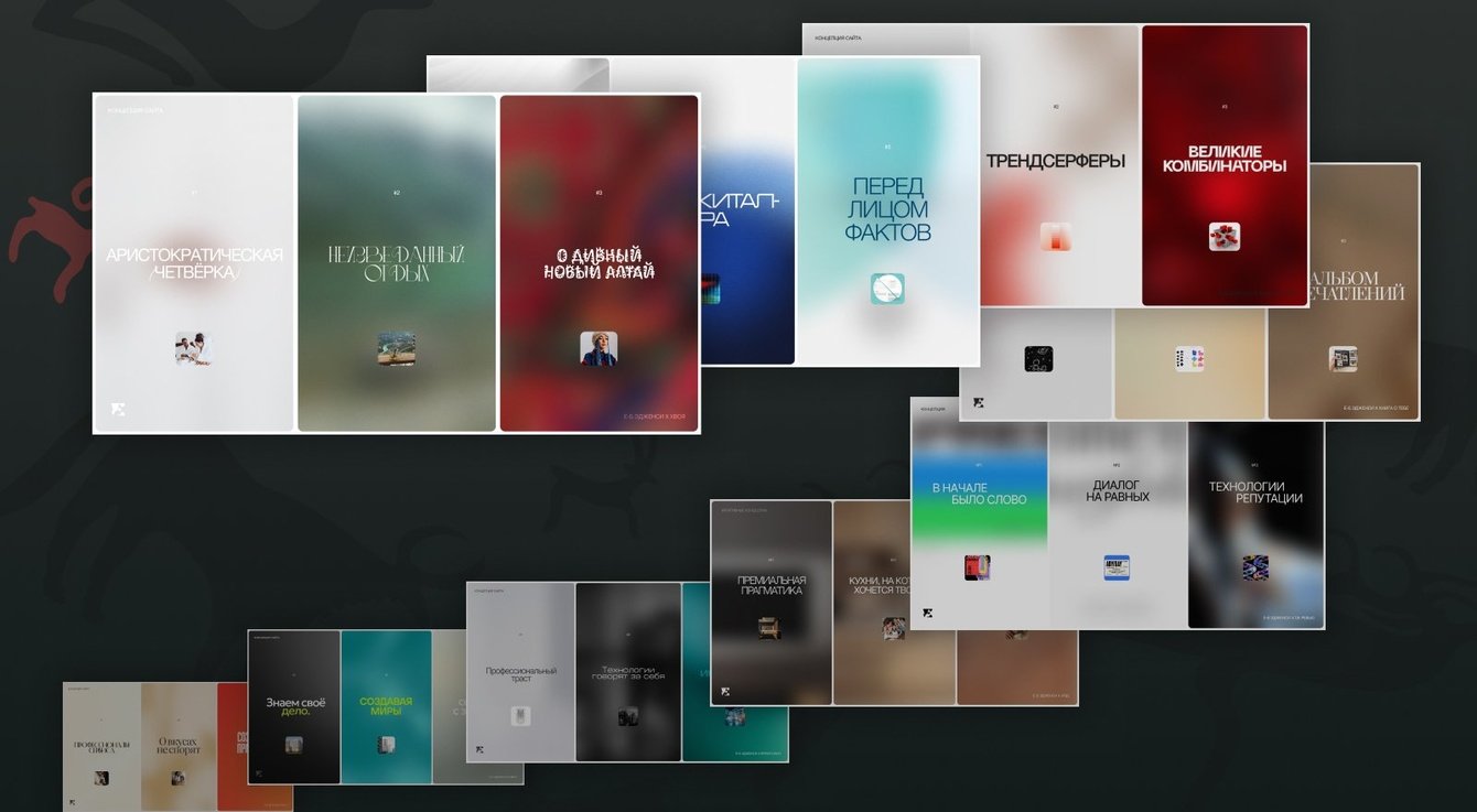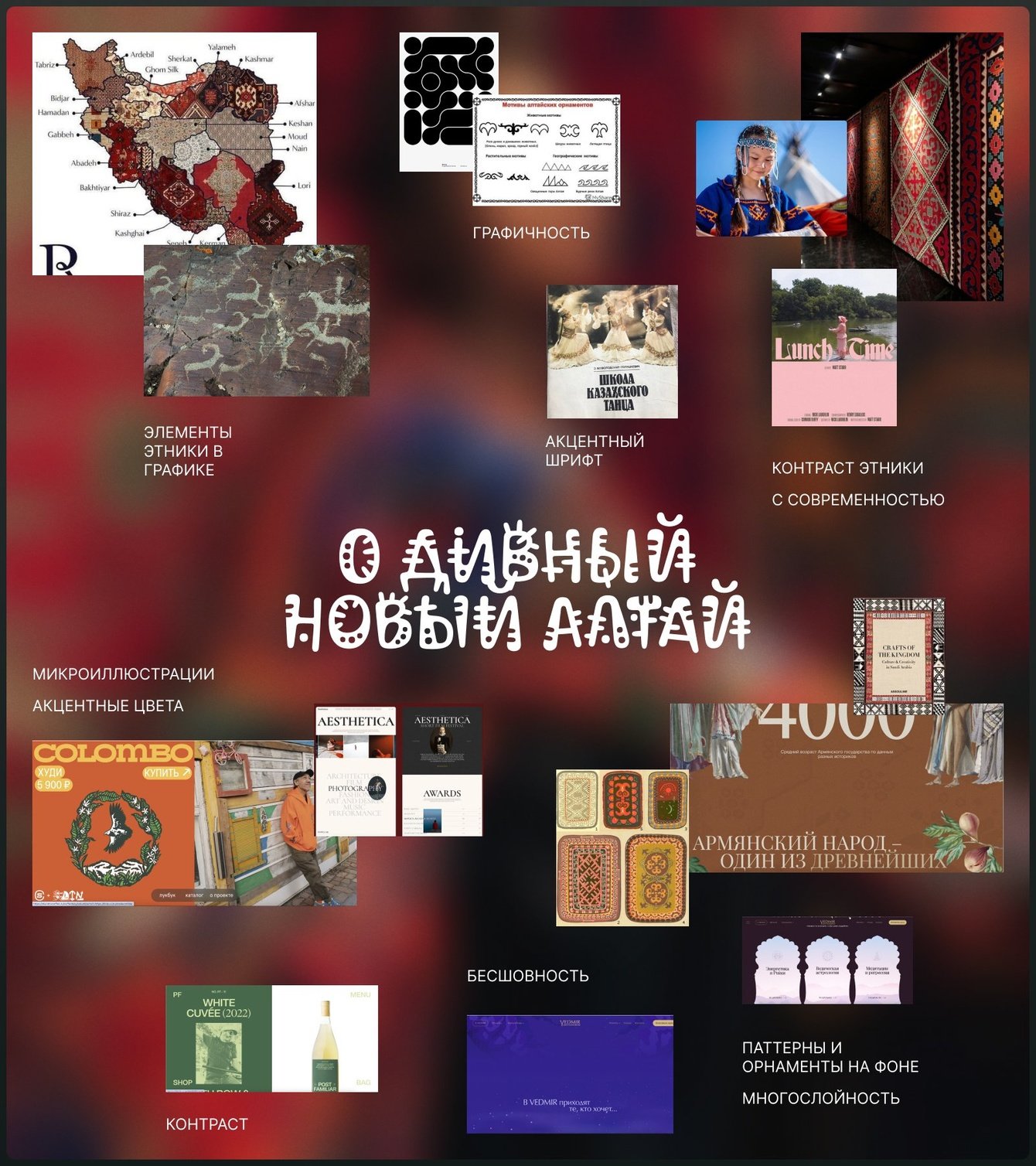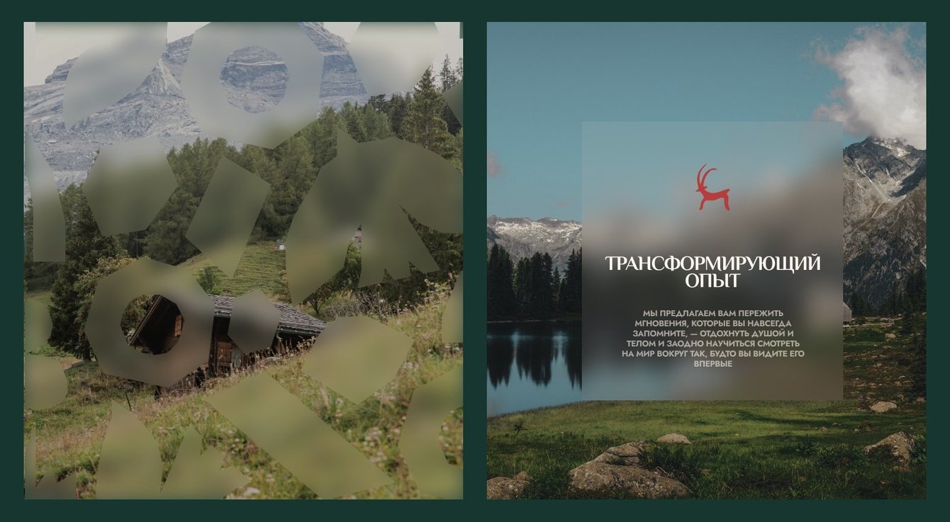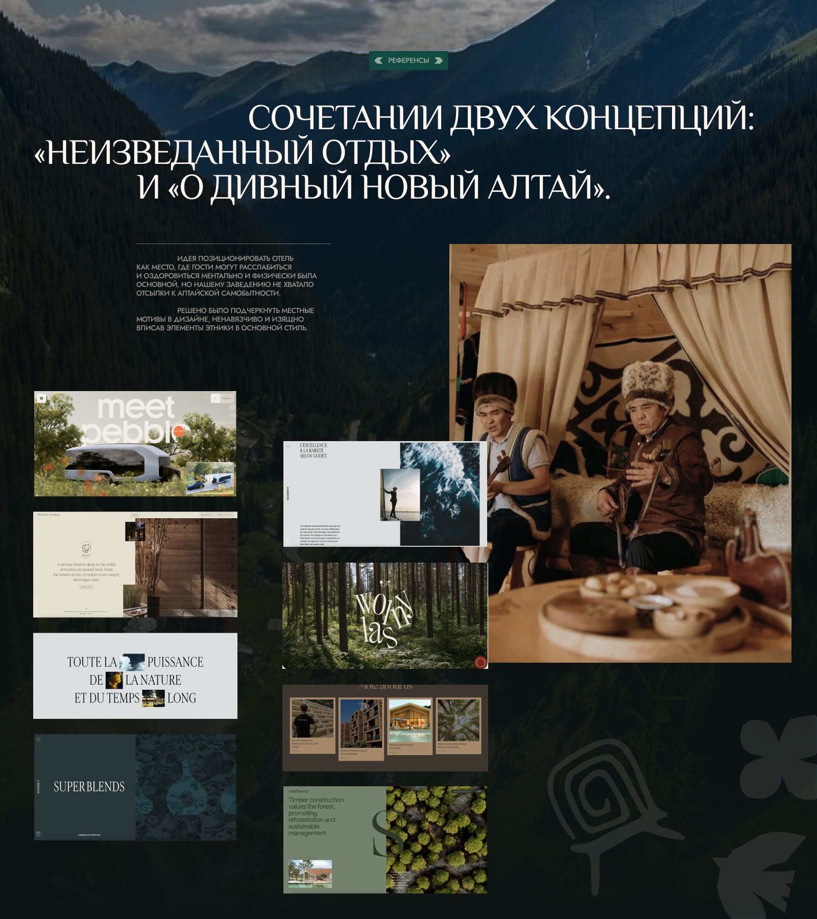 Необычная концепция отражает неоэтнический подход. В ней мы выстраиваем дизайн вокруг контрастов: сочетаем этнику с современностью, а фотографии с графикой, миксуем разные шрифты, вписываем в фирстиль узнаваемые паттерны и орнаменты края. Делаем акцент на неповторимой эстетике и связи с наполненным силой местом — представляем Алтай таким, каким его еще не видели гости.