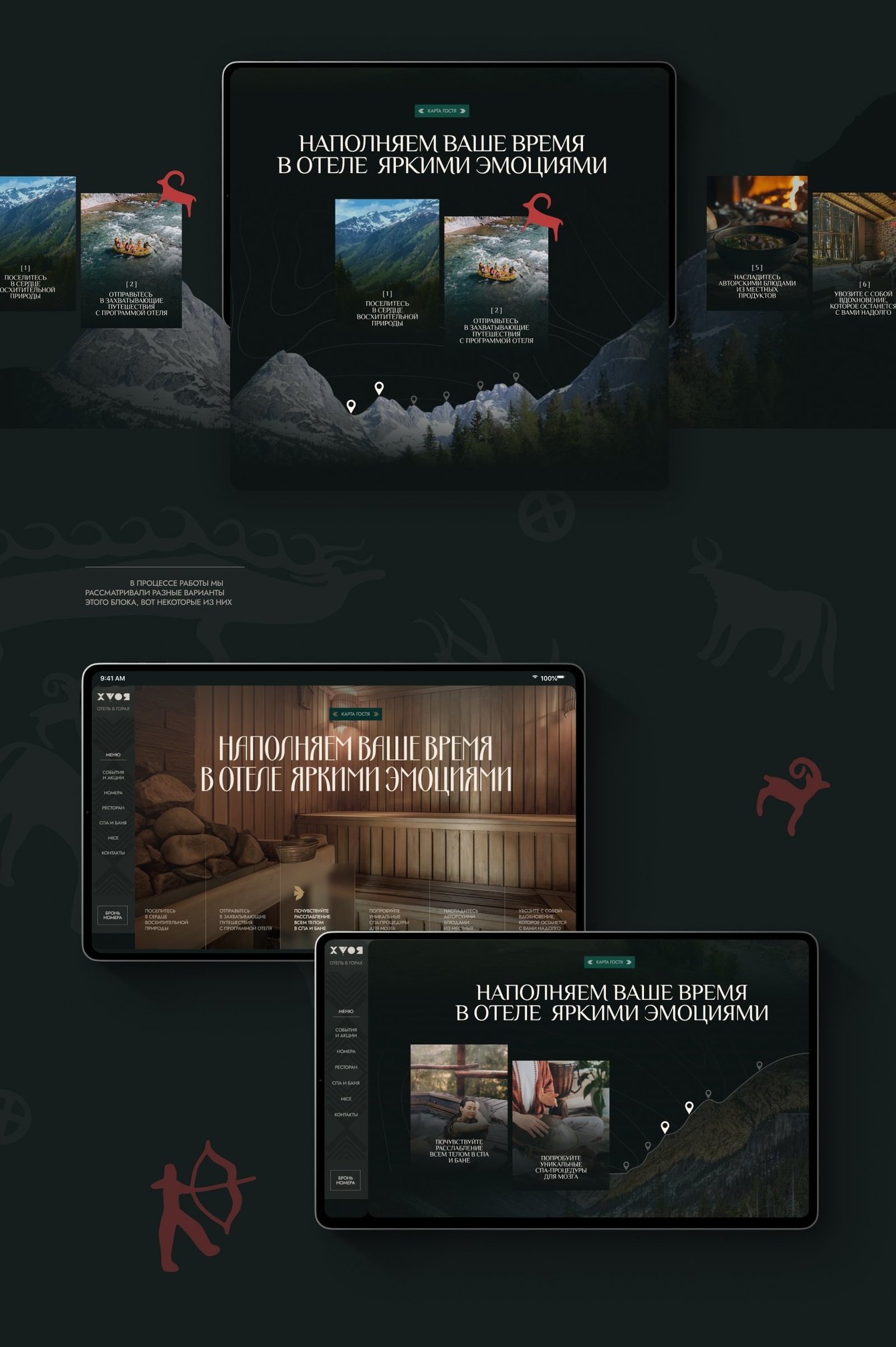 Особое внимание уделили блоку «Карта гостя»,чтобы раскрыть все предложения отеля и активности, которыми можно насладиться. Для неторопливого и последовательного изучения применили горизонтальный скролл, а путь гостя визуализировали всплывающими метками на горах — как процесс исследования алтайских вершин.