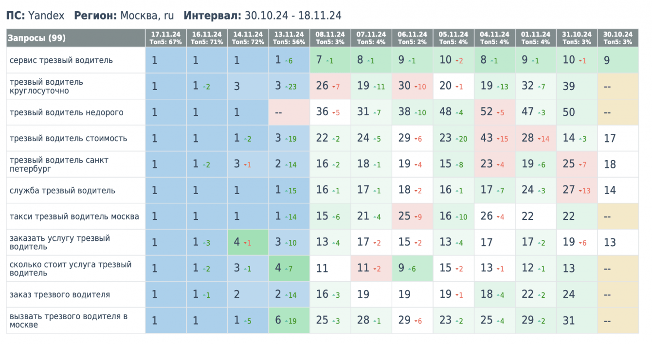 Мы начали работу в сентябре 2024 года. На старте проекта позиции сайта из собранного семантического ядра находились на 100+ местах. За 5 месяцев работы 56 % семантических ключей попали в ТОП-5 поисковой выдачи.