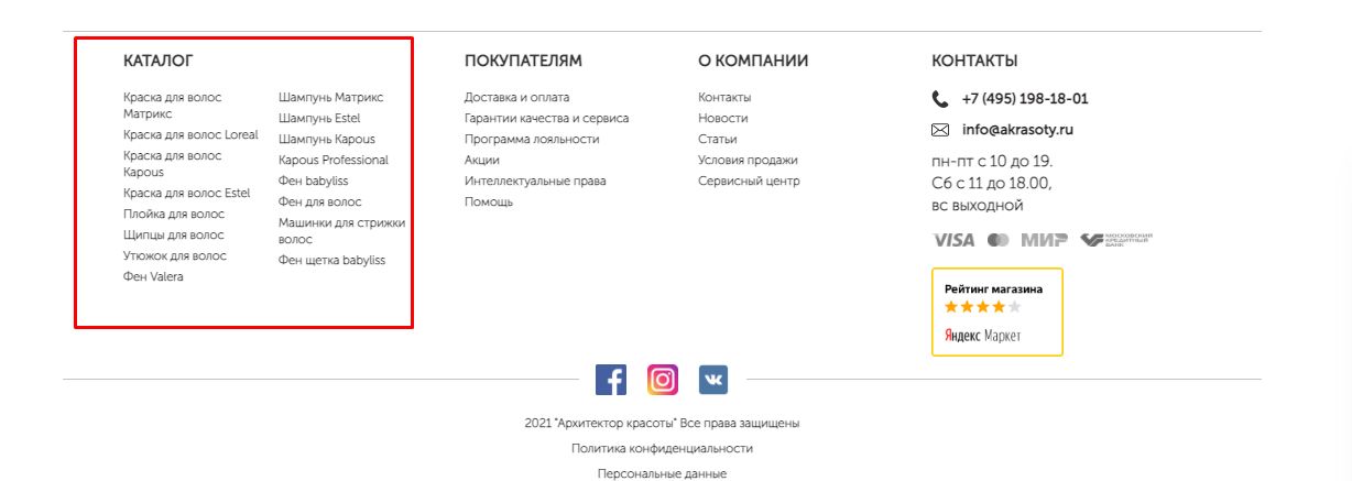 Внутренняя перелинковка: Реализована внутренняя перелинковка с использованием ссылок на продвигаемые страницы в footer сайта, что позволило улучшить навигацию по сайту и повысить вес продвигаемых страниц в глазах поисковых систем.
