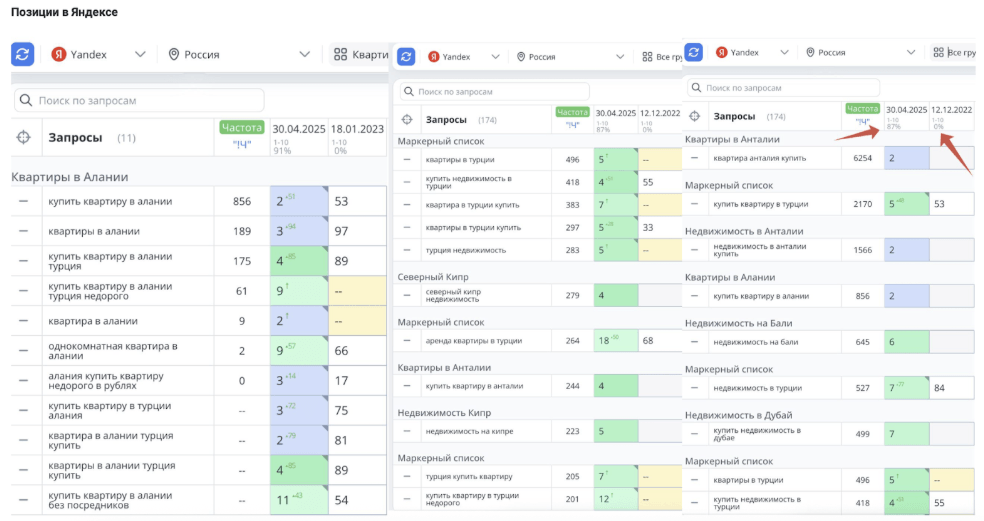 С января по март 2023 года мы устранили дубли страниц, настроили редиректы, оптимизировали внутреннюю перелинковку, провели полный аудит и начали работу над первыми приоритетными кластерами — например, “Купить квартиру в Алании”. Одновременно мы запустили системный линкбилдинг для наращивания авторитета сайта.