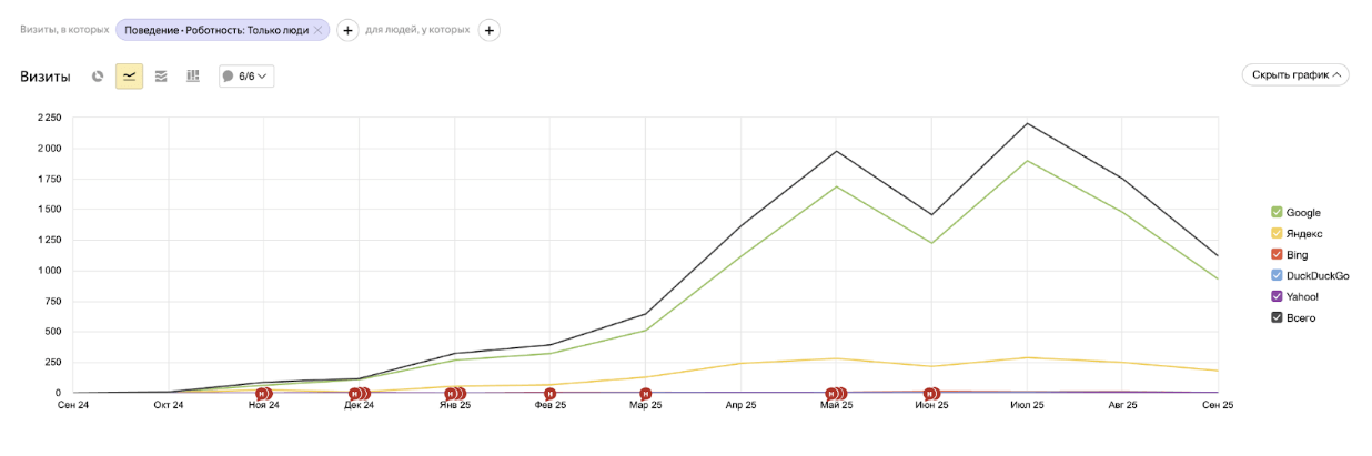 После проектирования мы запустили сайт с чистым техническим фундаментом. Настроили robots.txt и sitemap.xml, добавили ресурс в панели Яндекс.Вебмастера и Google Search Console, внедрили микроразметку Organization и Local Business.В первые месяцы после запуска команда устраняла недочеты: корректировала URL, настраивала редиректы и внедряла микроразметку Breadcrumbs и FAQ. Эти действия обеспечили правильную индексацию страниц и подготовили сайт к дальнейшей работе с поисковыми системами.