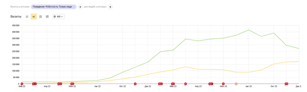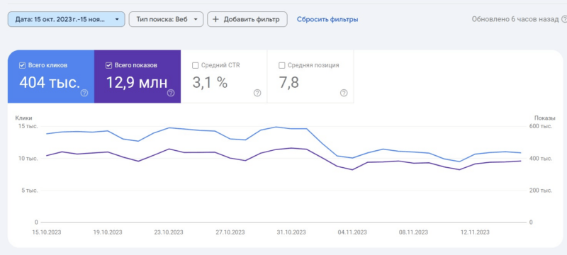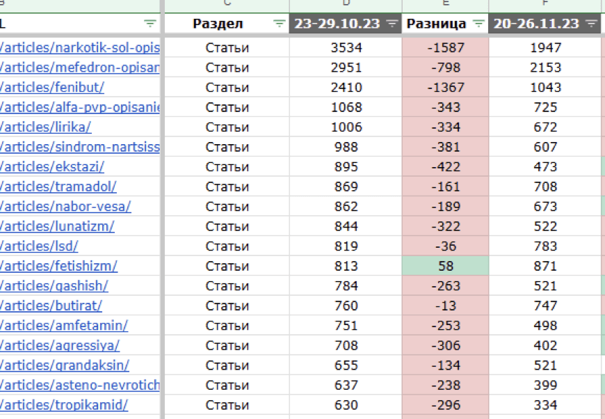 Лето не считается сезонным периодом для услуг в сфере психиатрии и борьбы с наркоманией. Это отражалось на ежегодных графиках, где мы наблюдали стагнацию трафика. Мы рассчитывали на подъем в сезон, но вместо этого получили резкий спад посещений. В начале ноября 2023 года трафик из Google сократился с 14 000 до 10 000 переходов в сутки.