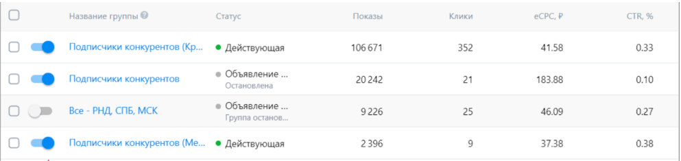 В июле на основе первой статистики выделили две рабочие аудитории: пользователей с прямыми интересами и подписчиков сообществ конкурентов. Так как именно подписчики конкурентов приносили вступления по минимальной цене, основной упор сделали на них. Дополнительно сегментировали эту аудиторию на крупные и мелкие сообщества.