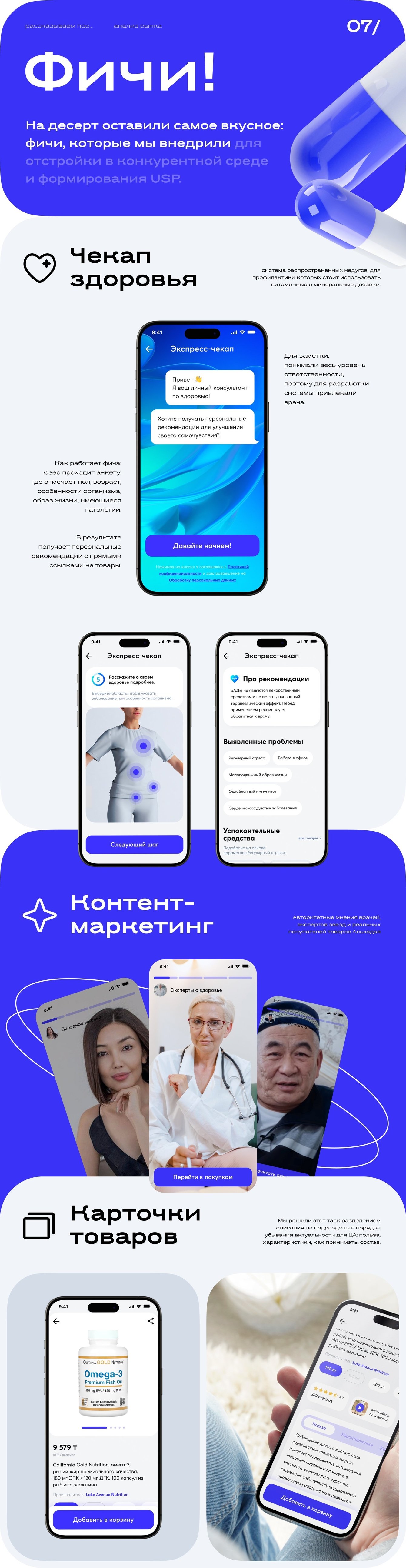 4. Внедрение системы аналитики. Система аналитики с минимальным вложением $$$ и всё это на этапе MVP? Идея, инициатива и разработка лично UX-дизайнера Найнэн: система распространенных недугов, для профилактики которых стоит использовать витаминные и минеральные добавки. Для заметки: понимали весь уровень ответственности, поэтому для разработки системы привлекали врача. Как работает фича: юзер проходит анкету, где отмечает пол, возраст, особенности организма, образ жизни, имеющиеся патологии. В результате получает персональные рекомендации с прямыми ссылками на товары. Таким образом, мы не только внедрили систему аналитики, но даже персонализировали пользовательский опыт, повысив лояльность к бренду. Ну мееед!