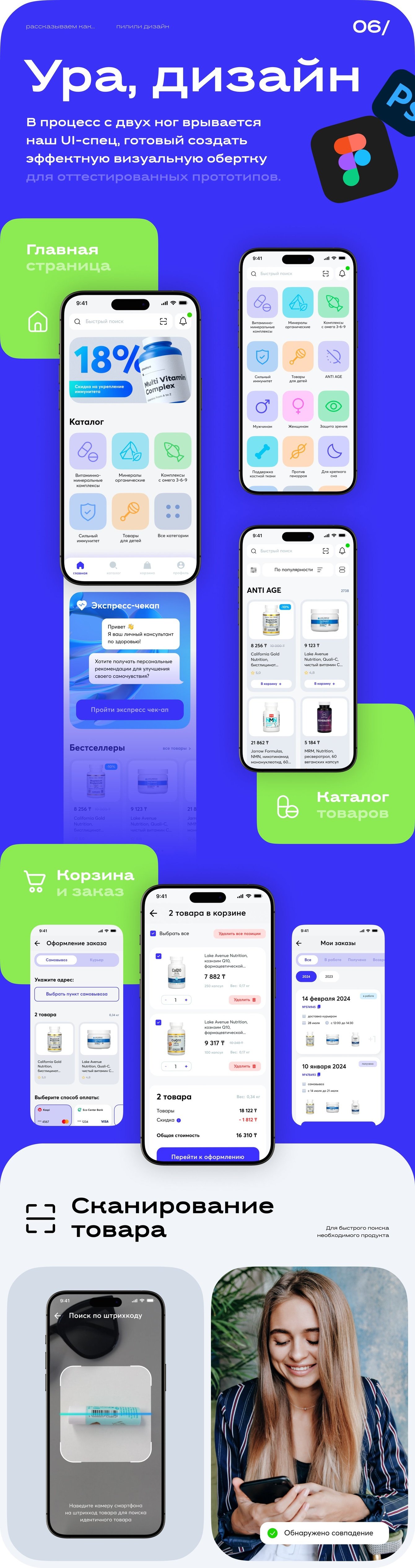 Если в офисе стоит гробовая тишина и вся команда ходит на цыпочках – значит, идет ювелирная работа над созданием прототипа. UX-дизайнер с хирургической точностью перевел пользовательский опыт с «языка» информационной архитектуры на «язык» прототипа, учитывая психологию поведения ЦА и законы UX. Не забываем и про фичи, которые выделили в процессе ресерча, чтобы отстроить наш маркетплейс от конкурентов в нише. Пришлось даже подключить врача (нет, не для UX-дизайнера) для создания системы аналитики здоровья юзера. Но об этом позже.