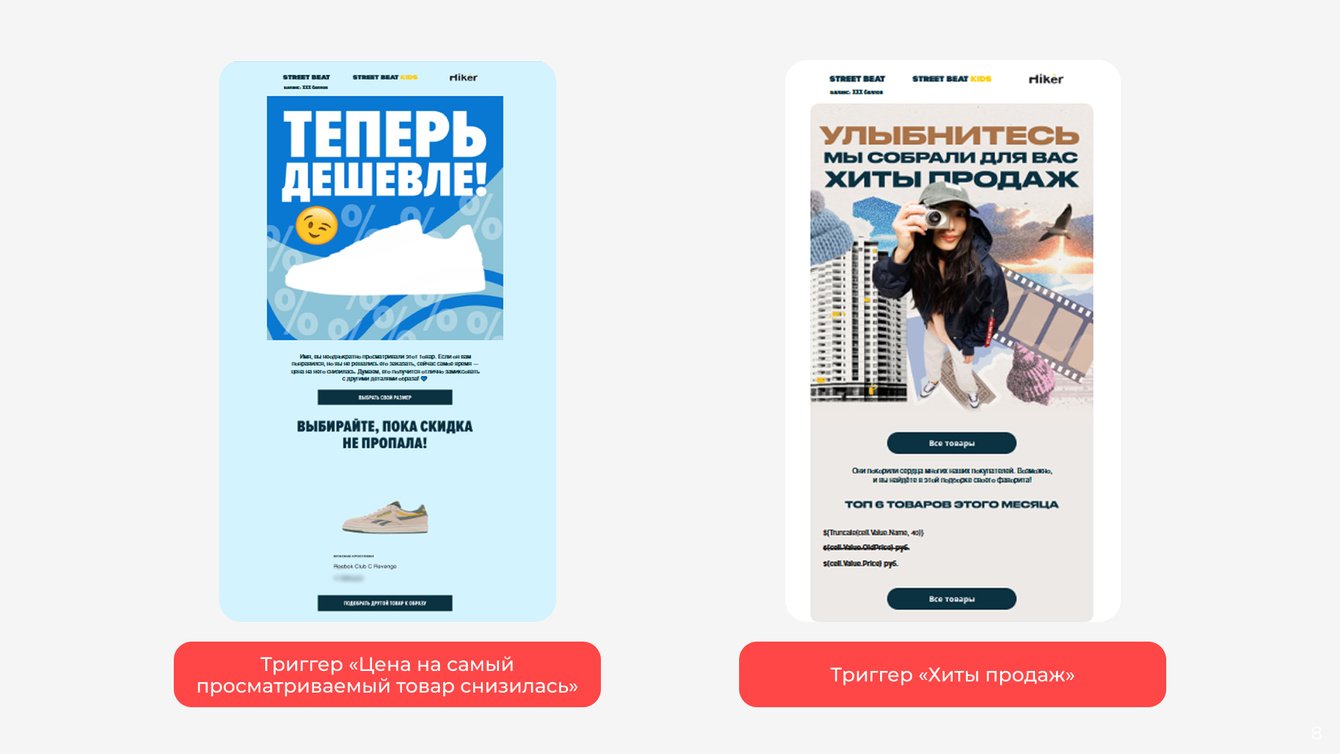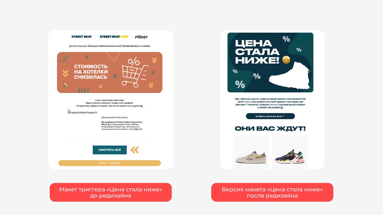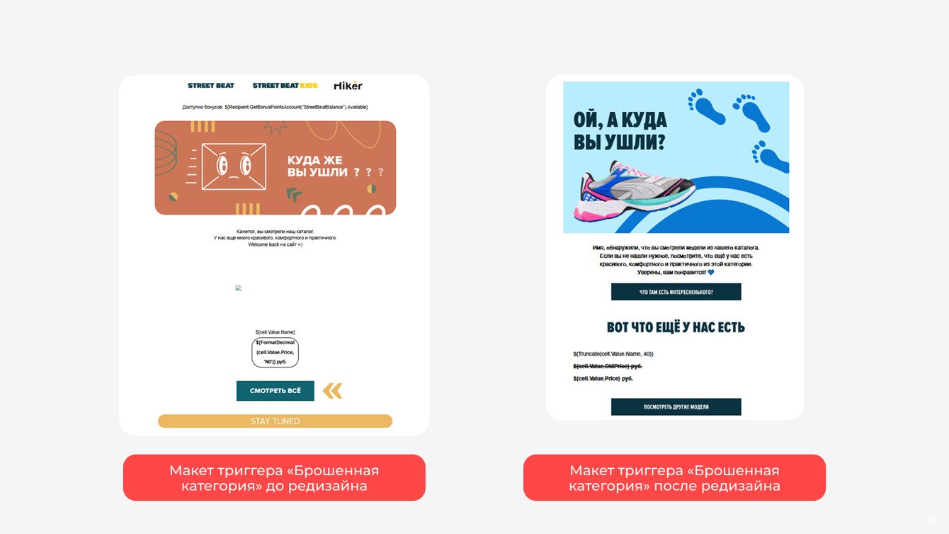 Для каждого выделенного в ходе аналитики сегмента разработали и внедрили 12 новых триггерных сценариев: «Реактивация клиентов без заказов», «Годовщина последней покупки», Cross-sell (перекрестные продажи), «Глубокий отток», «Отток», «Предотток», «Нет покупок обуви», «Хит продаж», «Хит распродаж», «Цена на самый просматриваемый товар снизилась», «Обогащение программы лояльности», «Отток новичков». В планах — добавить триггеры и на другие сегменты.