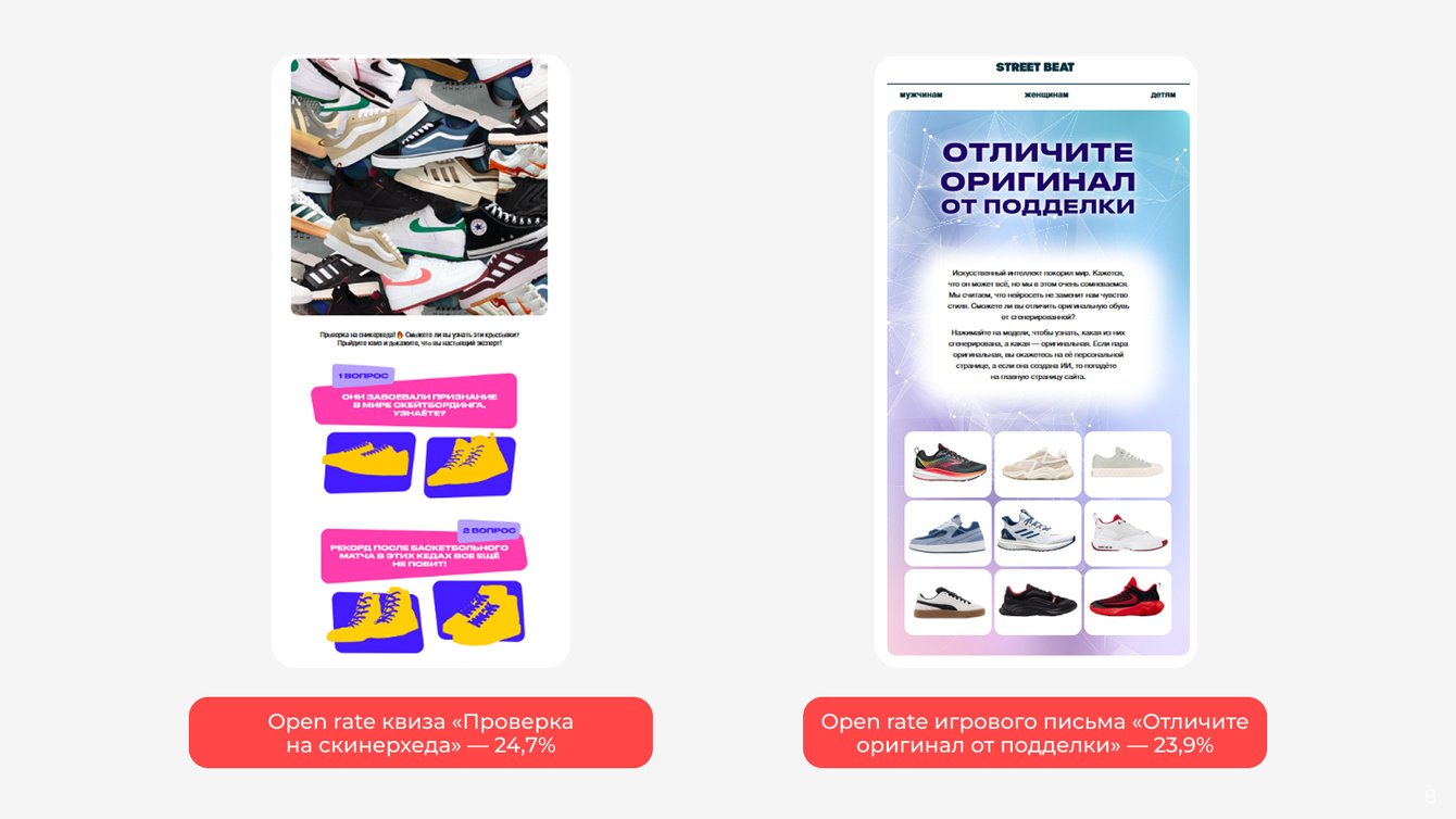 Клиентам понравилось: показатель открываемости рассылок «Проверка на сникерхеда» и «Отличите оригинал от подделки» оказался выше на 0,7%, чем средний показатель по массовым рассылкам в том же месяце. В пересчете на объем базы это означает около 3 тыс. дополнительных вовлеченных пользователей в каждой рассылке, которые глубже взаимодействуют с брендом и контентом.