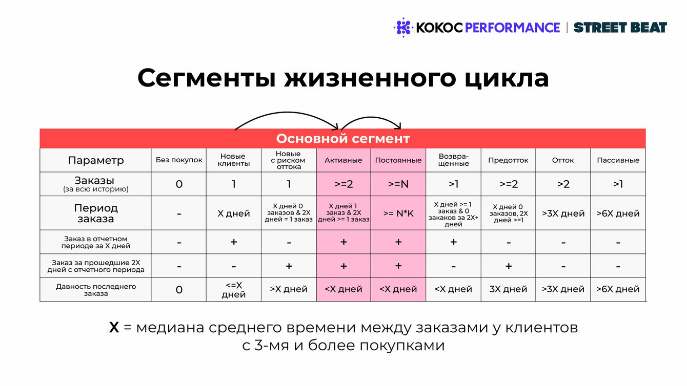 - Core (постоянные) — активные клиенты, достигшие эффективной частоты заказов.