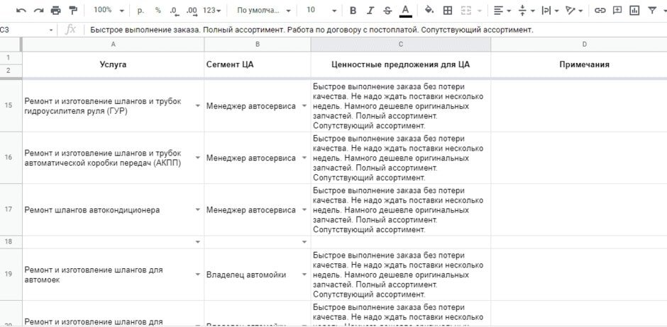 Когда каждая часть ЦА получит наилучшие условия, вырастет число конверсий и сократится процент отказов. Поэтому для каждого сегмента мы определили ценностные предложения в приоритетном порядке. Так, абсолютно для всех сегментов важен полный ассортимент и быстрое выполнение заказа. Оптовым клиентам важна стоимость: она должна быть дешевле, чем у оригинала.