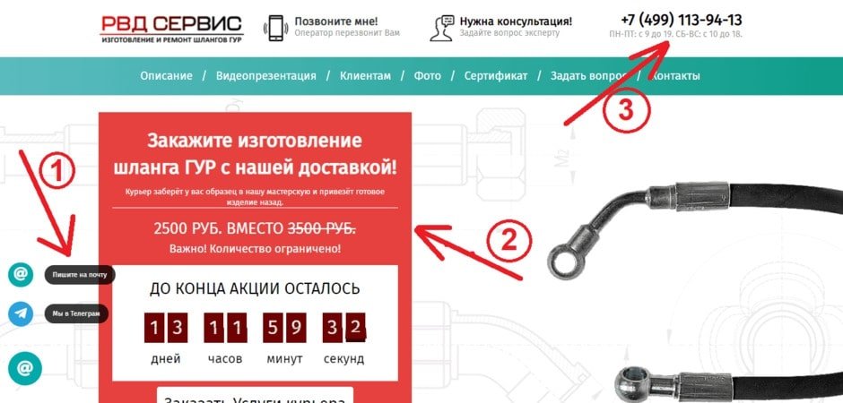1. Посетитель попадает с объявления на сайт, где есть несколько вариантов коммуникации с компанией: по телефону, через форму заявки или мессенджеры.