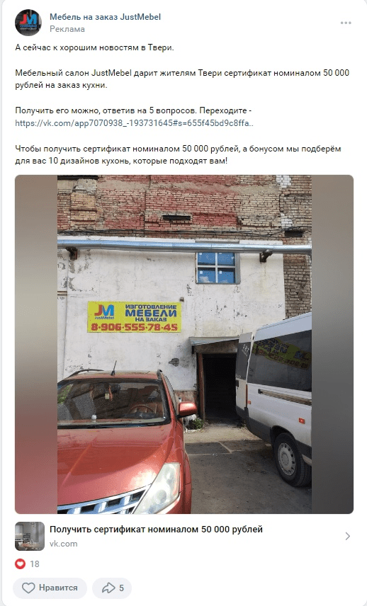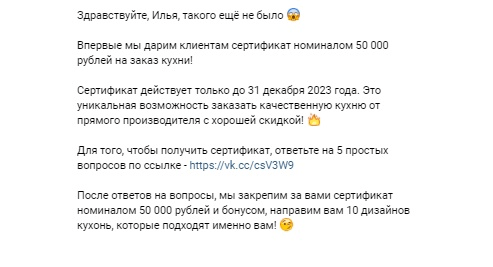 После чего менеджеры фиксировали за пользователем сертификат номиналом 50 000 рублей, высылали 10 дизайнов кухонь и обрабатывали пользователя до записи на замер.